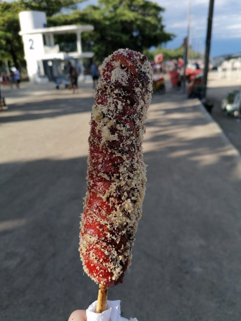 So wie die Münchner am Wochenende scharenweise den Englischen Garten oder die Isar besetzen, so besetzen die Brasilianer ihre Strände. Man merkt richtig, dass Wochenende/Feiertag ist. Familien sitzen mit Campingstühlen im Park neben dem Strand und grillen, Jugendliche laufen mit ihren Musikboxen durch die Gegend, es wird Ball gespielt, die Kinder laufen aufgeregt herum und alle lassen sich die Sonne auf den Bauch scheinen. An der Seite der Promenade gibt es (teils sehr provisorische) Essens- und Getränkestände, die wahrscheinlich keiner Inspektion standhalten würden, aber es riecht fantastisch. Ich gönne mir mein erstes Streetfood und vor allem meine erste Fleischmahlzeit!! Endlich!!