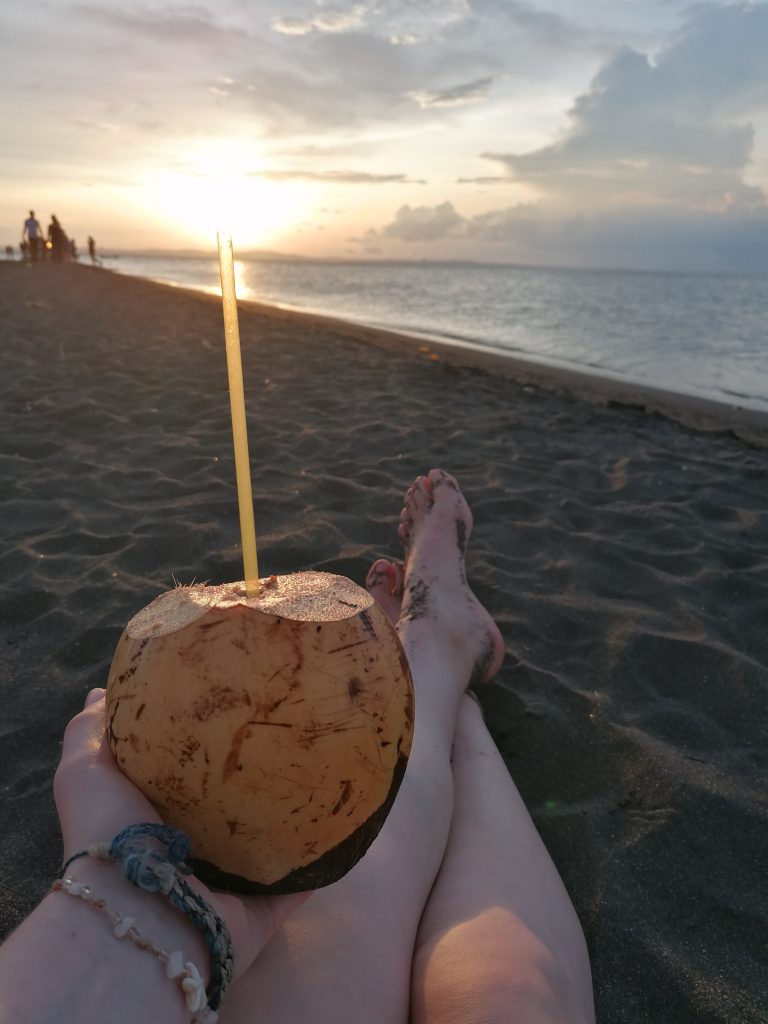 Nach etwa einer Stunde Fußmarsch kommen wir an der kleinen Strandzunge an. Es gibt zwar einige Leute, aber es ist auch wirklich schön, vor allem, als die Sonne beginnt zu sinken. Annelin gönnt sich ein Bier, ich mir eine Kokosnuss. Wir setzen uns in den Sand, stoßen an und beobachten das schöne Naturschauspiel.