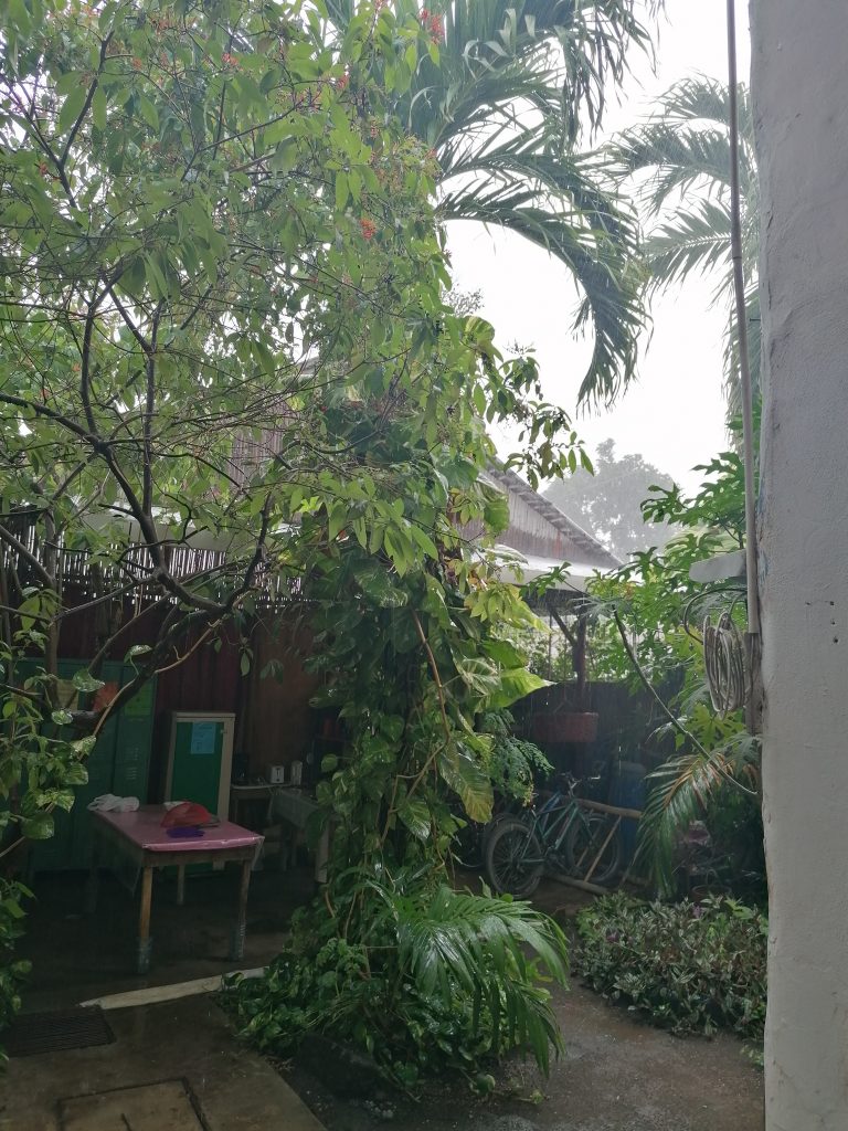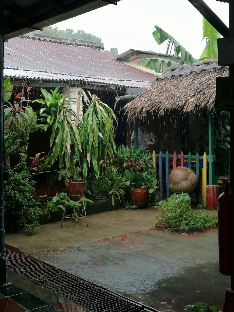 Wie sich rausstellt hatte ich Glück, es fängt nämlich genau in dem Moment an in Binnfäden zu schütten. Ich liebe den tropischen Regen, bin aber froh, dass ich ihn überdacht genießen kann und nicht noch auf dem Fahrrad sitze.