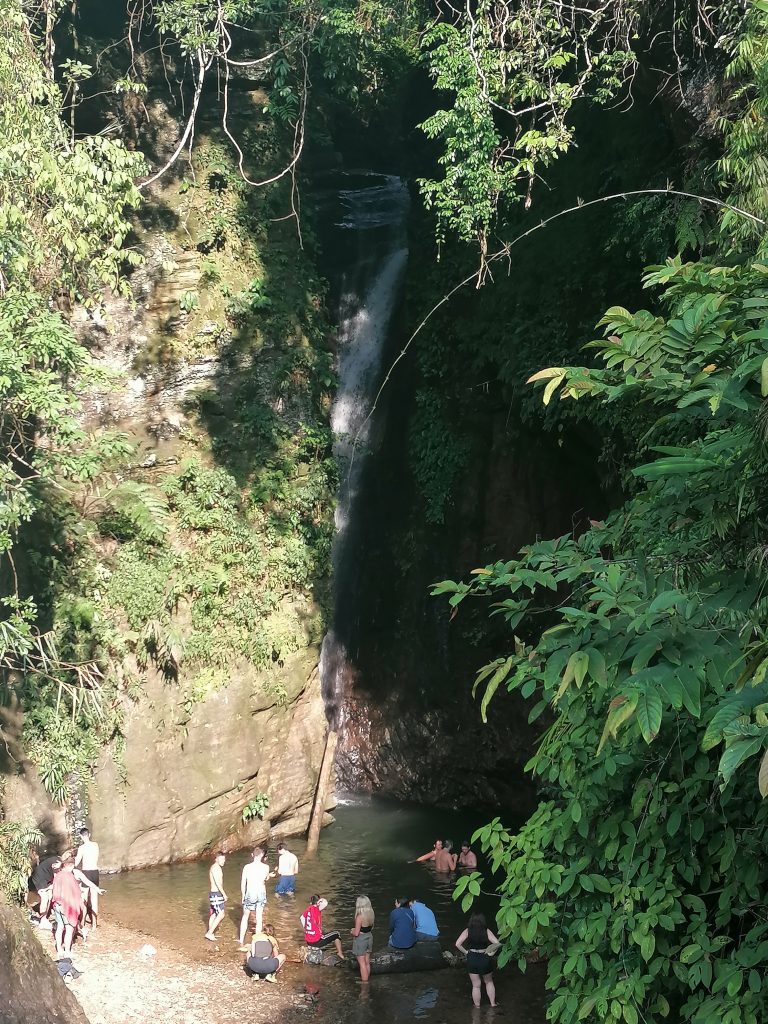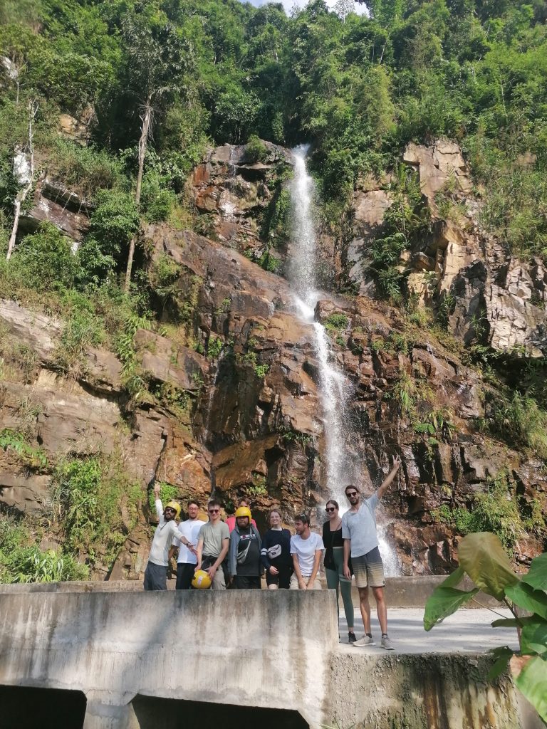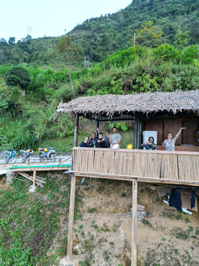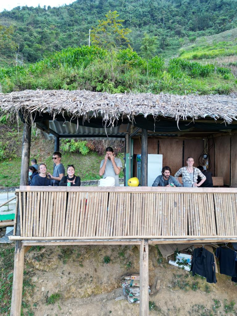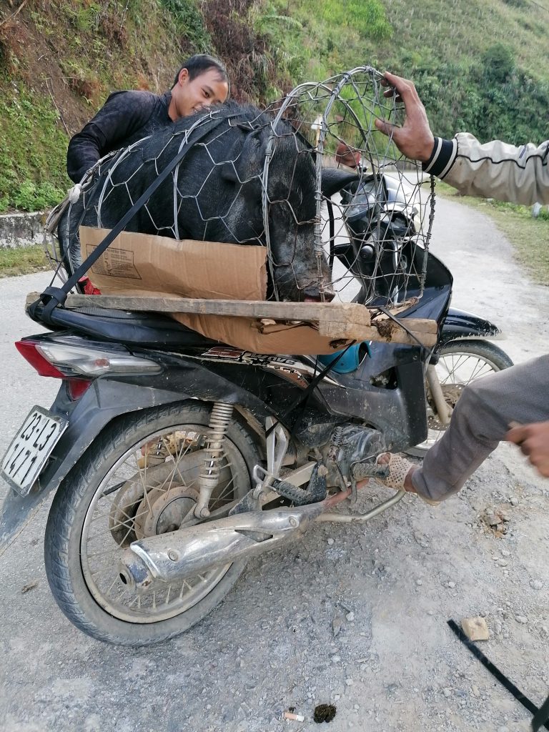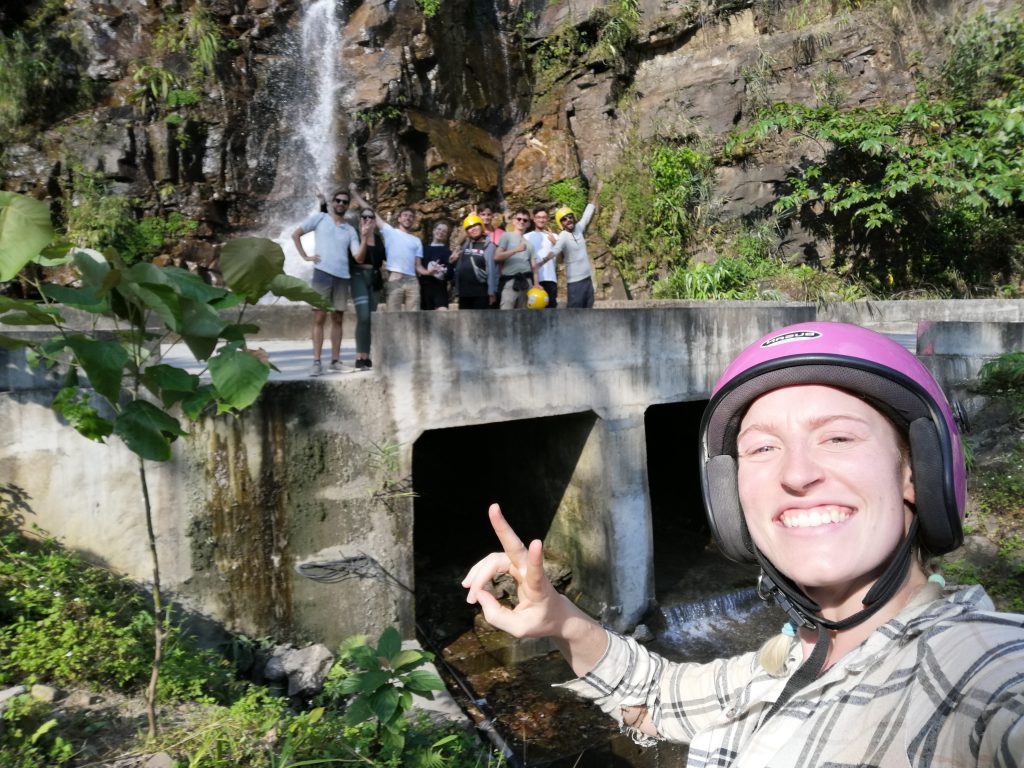 Zwei meiner neuen Bekannten haben eine Drohne dabei. Das war allein schon für diese Rollerfahrt eine fantastische Investition, ihre Aufnahmen sind großartig! Emma steuert die Drohne los, macht erst eine kleine Gruppenaufnahme und fliegt dann in die Berglandschaft, um ein tolles 360 Grad Video zu drehen. Währenddessen fällt unsere Aufmerksamkeit auf das, was hinter uns passiert: Ein Roller stoppt, zwei lokale Männer, die kurz etwas nachjustieren… auf dem „Rücksitz“ des Rollers in einem winzigen Käfig wird ein Schwein transportiert. Noch eine traurige Wahrheit über das Land: Alles was auch nur irgendwie möglich ist, wird gemacht, egal wie unkomfortabel… für Mensch und für Tier sowieso.