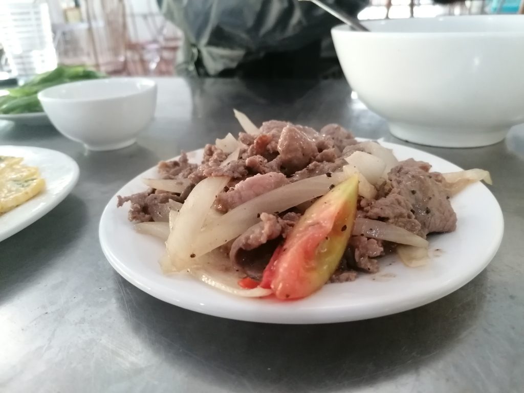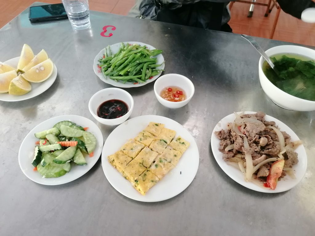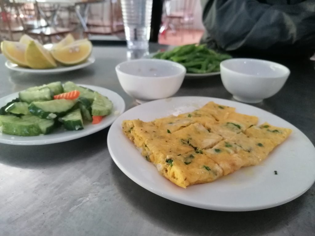 Das Frühstück ist wie das Abendessen ein Mix aus verschiedensten Kleingerichten und wieder sehr lecker. Es wird immer ein klassisch vietnamesischer Kräutertee serviert, der zwar recht bitter ist, mir aber ganz gut schmeckt… und mich entfernt an Mate erinnert, was mich in Argentinien-Erinnerungen schwelgen lässt.