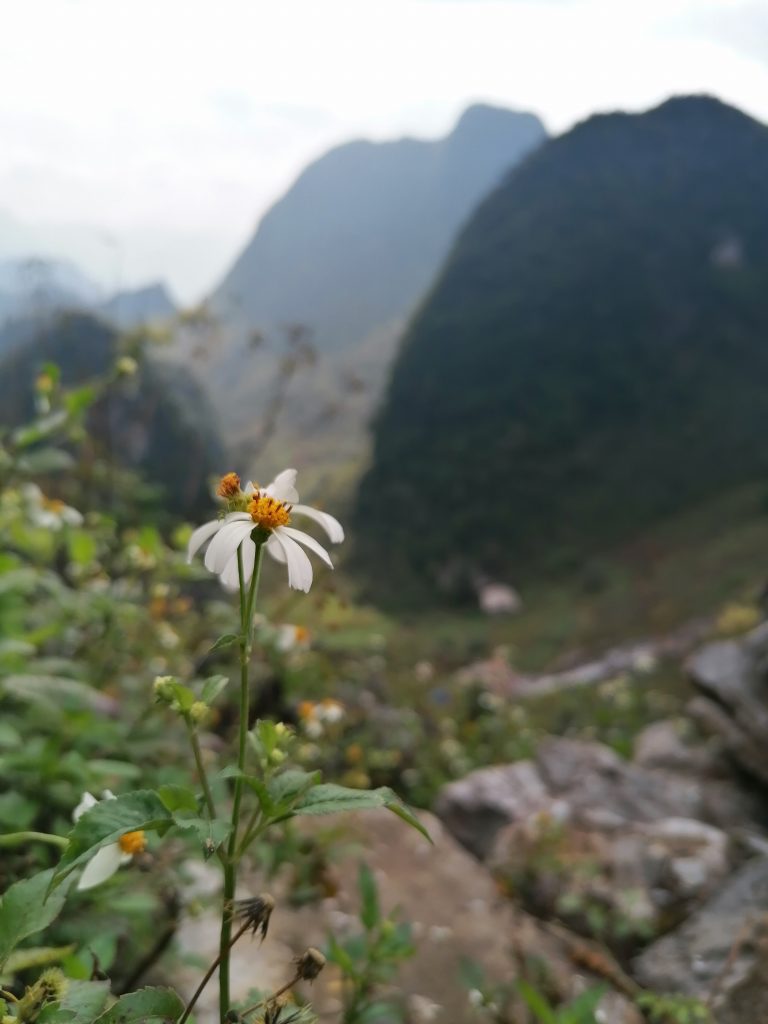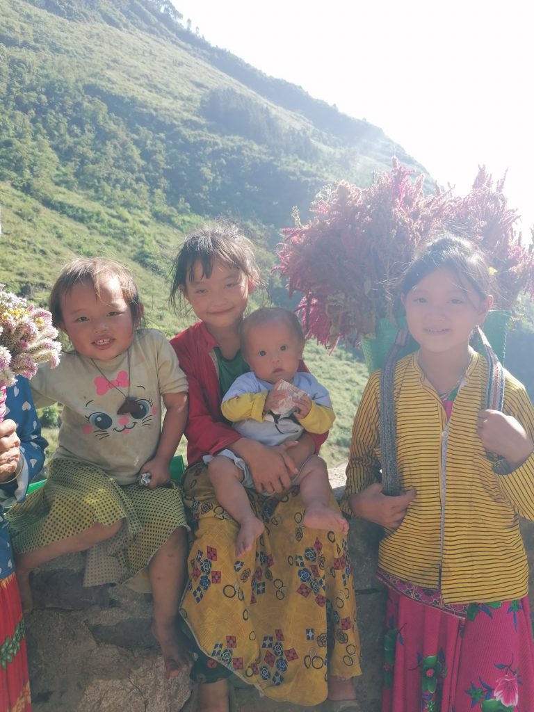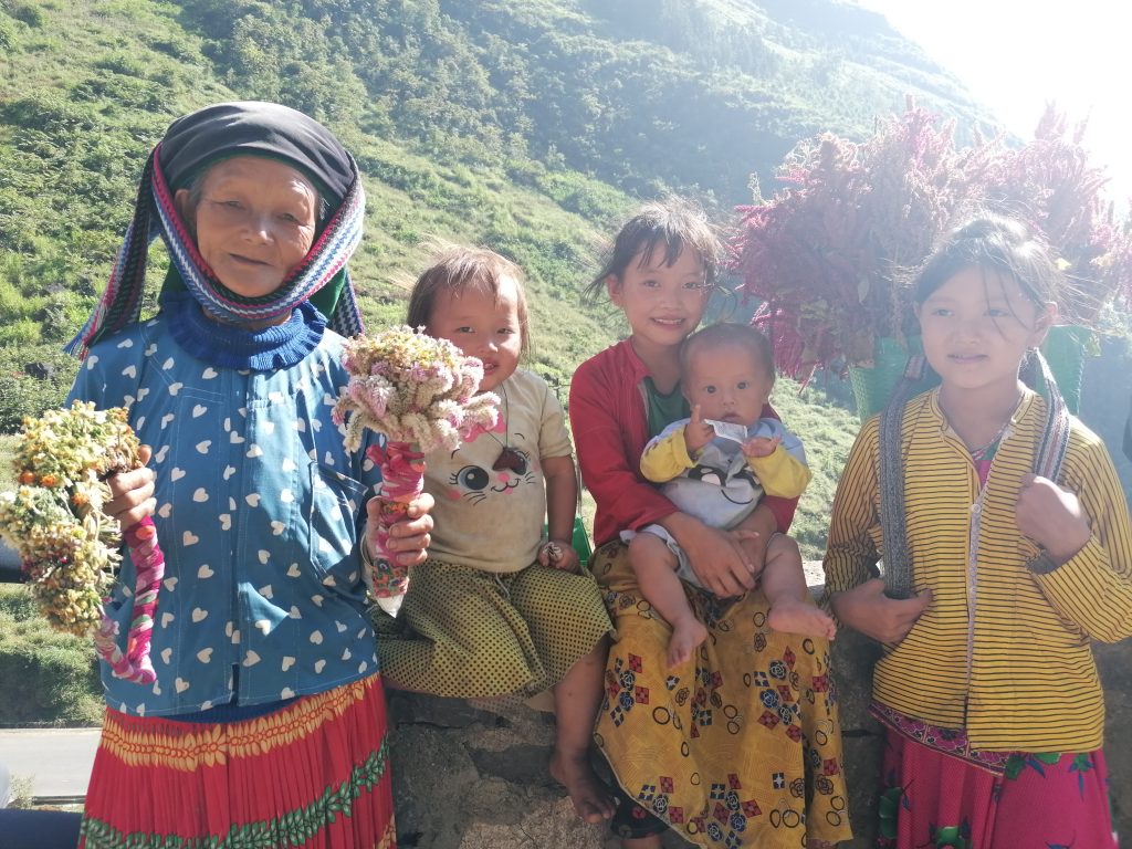 Wir halten an einem Aussichtspunkt, wo die lokalen Leute schön herausgeputzt sind und Kinder mit Blumenkränzen/-sträußen anbieten, sich für ein paar Dong fotografieren zu lassen. Ich nehme das Angebot an. Und mache einen kleinen Schnappschuss. Es fühlt sich ein bisschen seltsam an, ein bisschen unecht… Und auch zu echt gleichzeitig.