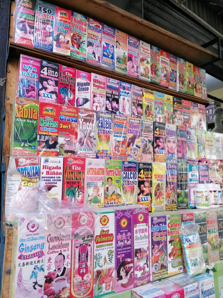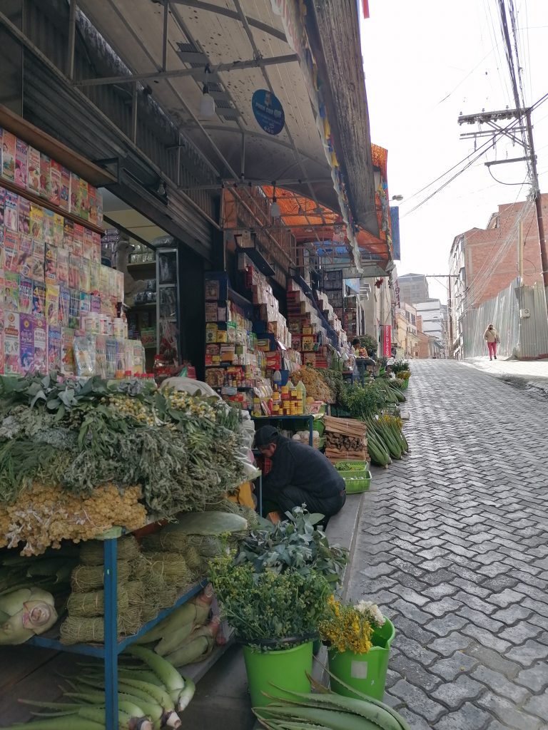 Wir beschließen, einen faulen Vormittag zu machen und zappen uns durchs bolivianische Fernsehen. Die Werbungen sind schrecklich, vor allem die für diese Bauchfettweg-Unterhosen (keine Ahnung, wie das heißt). Schreckliches Frauenbild und die Werbung dauert ewig. Dafür gucken wir zwischen durch ein paar Arztserien, unter anderem eine, die ich gut kenne, diesmal auf Spanisch, das ist ganz cool und wir entspannen uns dabei ganz gut. Erst gegen eins setzen wir uns fürs Frühstück auf die Dachterrasse, da schreibt mir noch eine alte Bekanntschaft, dass sie ebenfalls in La Paz ist: Nadine, aus Bariloche. Wir machen ein Treffen für den Nachmittag aus, auf dem Hexenmarkt. Klingt schaurig, ist es auch ein bisschen. Als wir dort ankommen, sehen wir schon die toten Lama-Babies über dem Eingang hängen. In Bolivien ist der Hexendoktor oder der Schamane noch eine sehr reale Tradition. Und ein Babylama bedeuten Glück und positive Energie. Außerdem finden wir in den Hexenständen einige Kräuter und viele Tees, die alles Mögliche bewirken sollen, vor alle Sexualprobleme lösen.