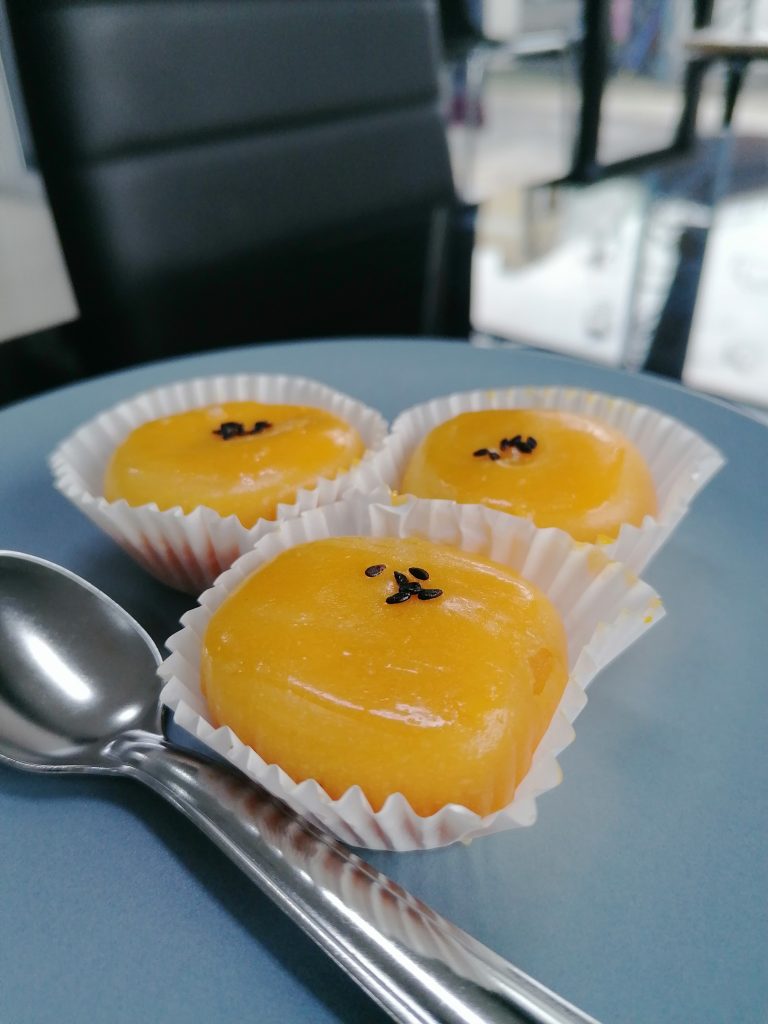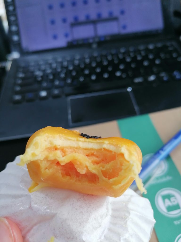 Auf Englisch sagt man „Salted Lava Egg Pie“ – also gesalzener Lava Eierkuchen. Außenrum ist es ein bisschen wie ungebackener Kuchenteig, und innen ein wenig wie gekochtes und doch flüssiges Eigelb, aber alles in kühl und dezent salzig. Der Geschmack ist zunächst ungewohnt, aber innerhalb von kürzestes Zeit werde ich total verrückt danach. Die Konsistenz ist unglaublich und ich suche ewig nach Rezepten, das selbst zu machen… Leider scheint das ein ziemlich einzigartiges Produkt zu sein, das so nur eine Firma in Thailand herstellt. Tja, dann muss ich mich wohl daran satt essen. Und das tue ich. Danach sieht man mich selten ohne diese kleinen Küchlein in der Tasche herumlaufen.