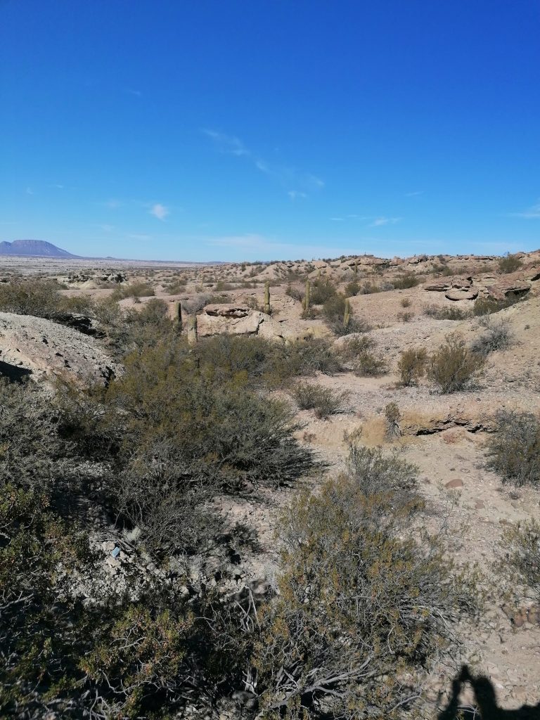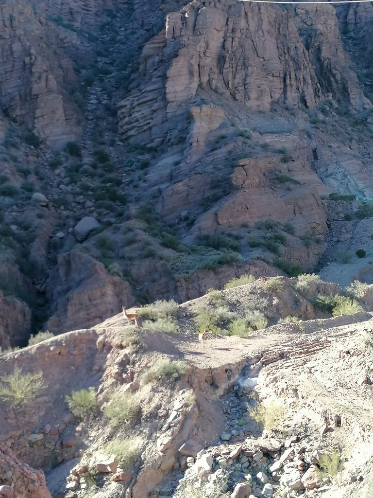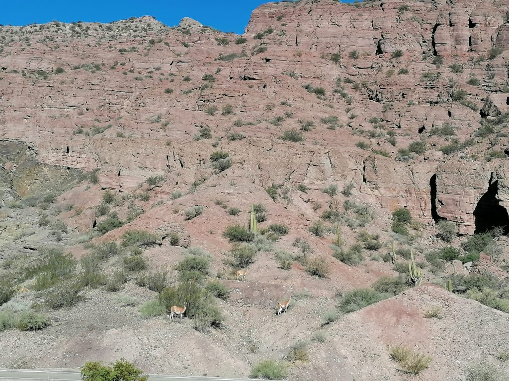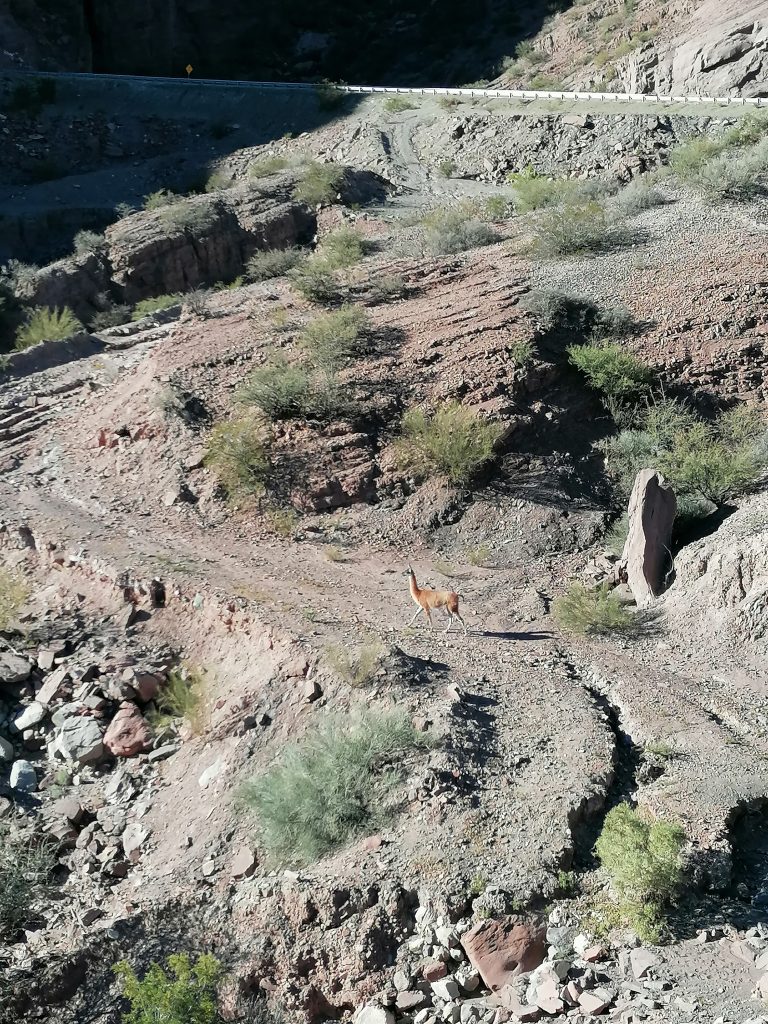 Und das war’s. Der Bus steht bereit, jetzt geht es in den Park selbst. Wir bilden eine Karawane aus Tourbussen und Autos. Man kann nicht alleine in den Park, es geht nur mit einer geführten Tour, selbst, wenn man im Privatfahrzeug ist. Das hätte ich trotzdem bevorzugt. Naja. Der Bus holpert die steinige Strecke hinunter in ein Tal, dass dem Ausdruck „tot“ nicht besser entsprechen könnte. Kahle Felsformationen, steinige Böden, nichts außer Dornenbüschen, Kakteen und stacheligen Sträuchern. Faszinierend, wie sich Pflanzen und Tiere hier durchkämpfen können. Wir sehen ein paar Guanacos, denen das fressen hier sicher nicht leicht fällt. Dagegen ist Pampa ja eine Oase. Dennoch wohnt dem Ort eine eigenartige Schönheit inne.