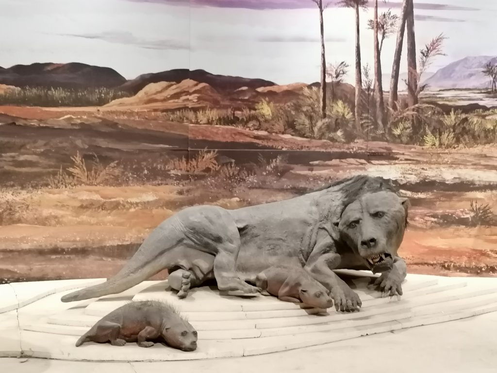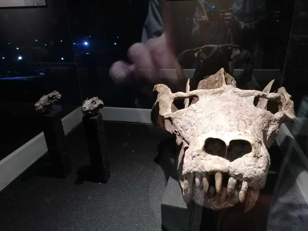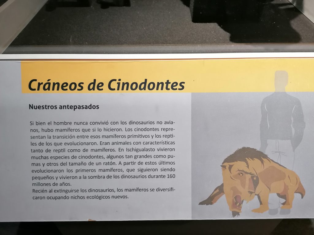 Cráneos de Cinodontes genannt. Sieht ein bisschen aus wie ein Säbelzahntiger, hat aber Äonen vorher gelebt. Das ist der Vorfahr des Menschen. Ich finde, dass man das ganz deutlich an der Kopfform erkennt. Die Augen nach vorne gerichtet, der ganze Kopf wirkt wie eine Mischung aus Mensch und Tiger. Ich bin fasziniert, meinem Urahn gegenüber zu stehen… oder meiner Urahnin, in dem Fall. Sie sieht ziemlich cool und ganz schön gefährlich aus! Charakteristisch gesehen hatte sie wohl Eigenschaften vom Reptil, als auch vom Säugetier. Von ihr Stammen auch die ersten Säugetiere ab, die über 160 Millionen Jahre im Schatten der Dinosaurier leben.