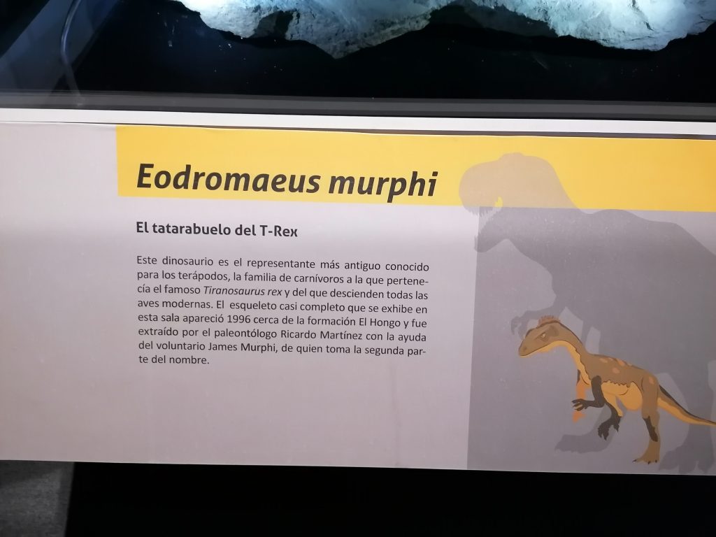 … ist Eodromaeus murphi, der Urahn der Fleischfresser. Ein kleiner Dinosaurier, kaum kniehoch, lebte vor 220 Millionen Jahren. Sein Nachfolger – der T-Rex – wandert vor 65 Millionen über die Erde. Von ihm stammen alle Vögel auf der Erde ab. Den Namen Murphi verdankt der Dino übrigens einem Voluntär, der das Skelett entdeckt hat… das stelle ich mir auch als eine tolle Situation vor. „Äh Chef, isch musst grade mal für kleine Voluntäre und isch glaub, isch hab einen Dino entdeckt, also freigepinkelt…“
