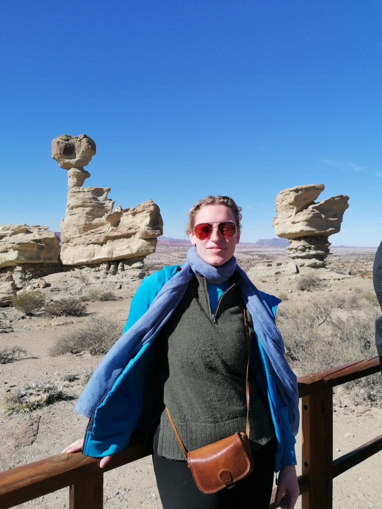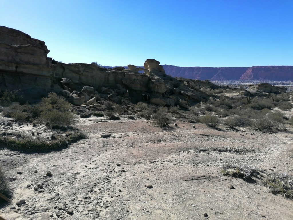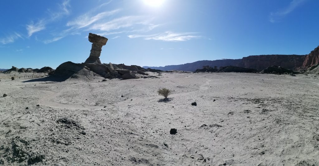 Wie eine große Klippe halten wir uns immer rechts davon, mir kommt es vor, als wären große Säulen in den Stein gehauen, die den Berg tragen, wie in einem Tempel oder einer Kirche, nur eben natürlich. Es ist sehr schön. Der gesamte Nationalpark ist es wirklich wert gesehen zu werden. Auf der anderen Seite der roten Wand liegt noch ein zweiter Nationalpark, der Talampaya-Park der Provinz La Rioja. Diese Wand bildet die Provinzgrenze. Ich habe mich bereits entschieden, dass der andere Park sicher auch sehr schön ist, aber ich sicherlich nicht zwei Mal diese Weite Strecke und die Tour auf mich nehme, nur um eine ähnliche Landschaft zu sehen. Einer reicht, meine Wahl fiel auf das Valle de la luna. Zurück im Besucherzentrum bekommt die Tour dann endlich ihr Mittagessen… um halb fünf. Ich entscheide mich, draußen in der Sonne zu bleiben und dort meine Sandwiches/Bananen zu essen. Dann laufe ich noch ein bisschen auf dem Gelände herum, mache Bilder vom Aussichtspunkt und entdecke ein verstecktes Denkmal oder vielleicht sogar ein Grab, das meine Aufmerksamkeit auf sich zieht: