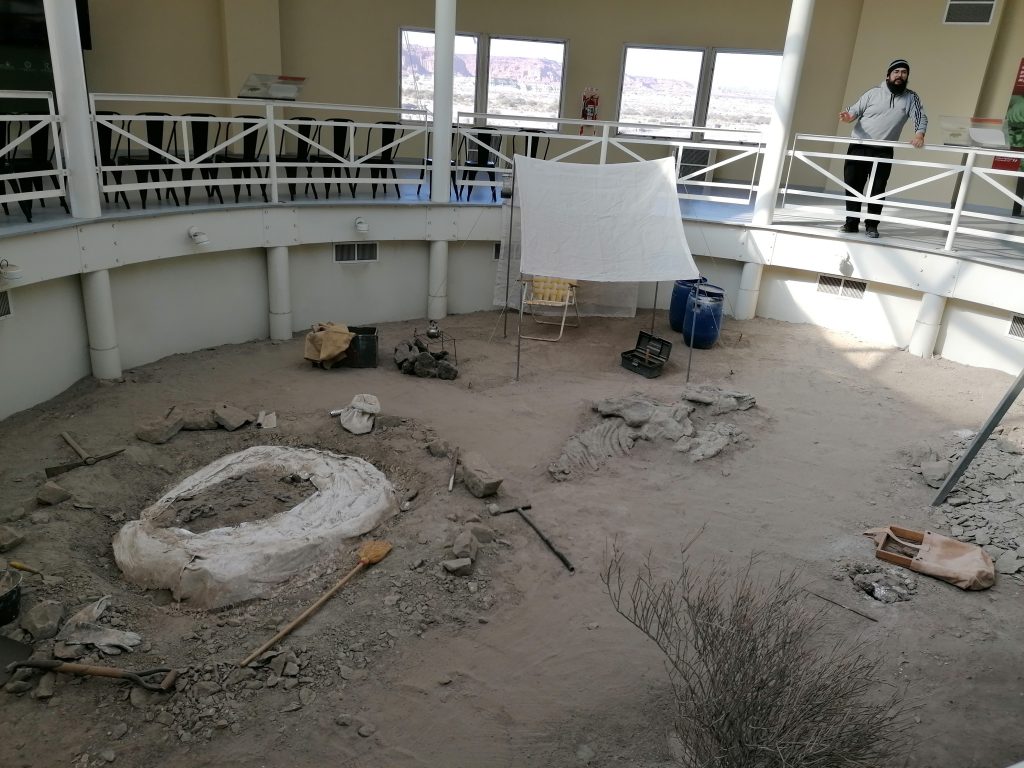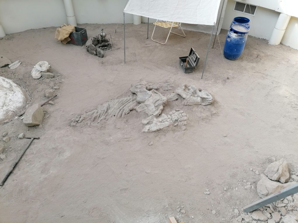 Wir fahren in ein Infozentrum, wo ein Modell einer Ausgrabungsstätte dargestellt ist. Ein Mitarbeiter erklärt, wie genau es funktioniert, aber ehrlich gesagt verstehe ich ihn schlecht. Ich meine, das Skelett wird nur grob freigelegt, eingegipst, in ein Labor transportiert und dort vorsichtig aus dem Stein gebohrt. Könnte aber auch Quatsch sein.