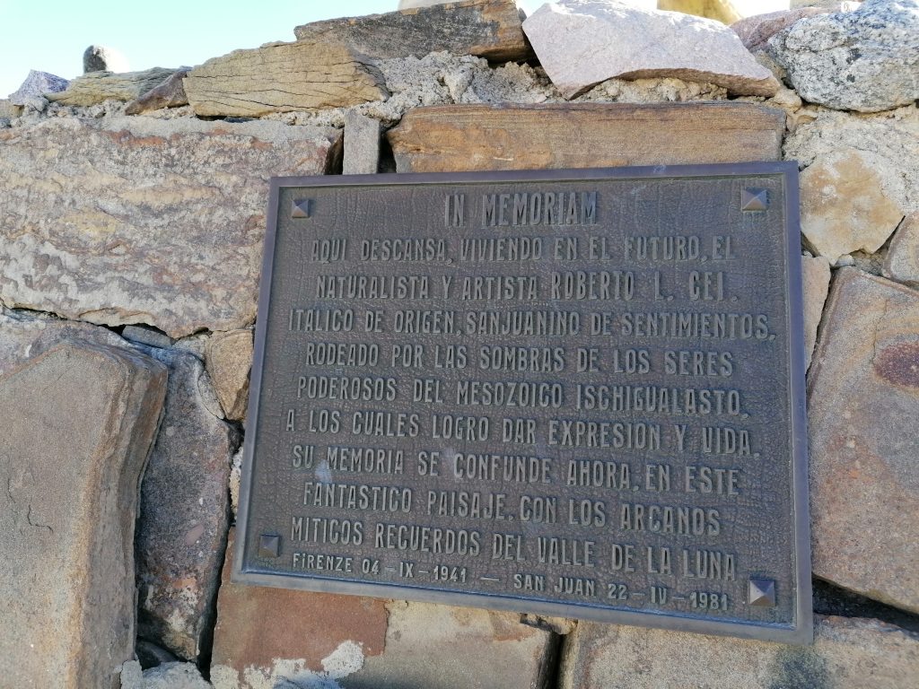 Auf der Tafel steht: Hier ruht, lebend in der Zukunft der Künstler und Naturalist Robert L. Cei. Gebürtiger Italiener, im Herzen jedoch aus San Juan. Er liegt umgeben von den Schatten der Mächtigen des Mesozoikum in Ischigualasto, denen er Leben und Ausdruck verliehen hat. Sein Andenken wird heute in dieser atemberaubenden Landschaft mit den unergründlich mythischen Erinnerungen an das Valle de la Luna verbunden.“ Florenz, 4.09.1941 – San Juan 22-4-1981.