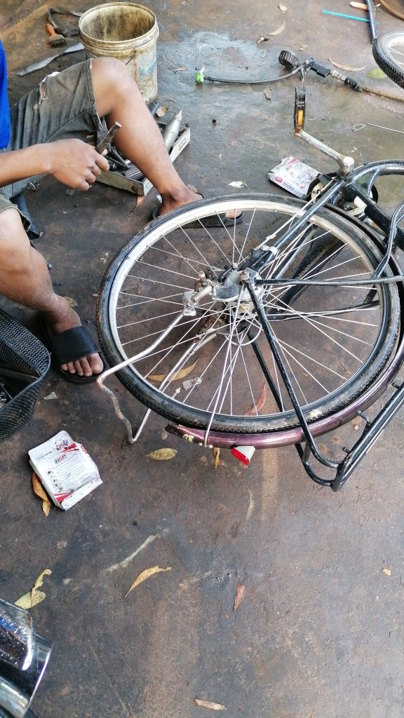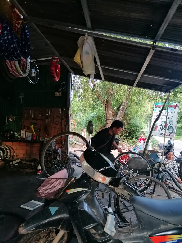 Nicht ganz alleine, glücklicherweise. Nachdem ich über meinen neuen Rückschlag genug gestöhnt habe, beschließe ich, das beste aus der Situation zu machen und loszulaufen. Hilft ja alles nichts, die Sonne beginnt tiefer zu stehen und wenn ich wirklich alles laufen müsste, stehen mir noch zweieinhalb Stunden Marsch bevor. Glücklicherweise bleibt mir das erspart. An der nächsten Kreuzung steht wieder Tempel mit einem Checkpoint, der meine Situation schnell erkennt. Er deutet auf eine abzweigende Straße, lauf da etwa 10 Minuten entlang, dort ist eine Werkstatt! Ich atme erleichtert auf und bedanke mich. Und tatsächlich, nach kurzer Zeit taucht ein Schuppen auf, in dem eine Familie umherwuselt, sowie diverse Hunde und Katzen. Sie grüßen mich freundlich und ein junger Mann schaut sich mein Fahrrad an. Ich kann glücklicherweise über Handyübersetzer ein bisschen kommunizieren, denn die Leute sprechen kein so gutes Englisch. Ich habe auch genug Empfang, dass ich meine Fahrrad-Verleih-Firma anrufen und ihnen sagen kann, was passiert ist. Während der junge Mann meinen Fahrradschlauch verarztet, erkläre ich am Telefon, was passiert ist.