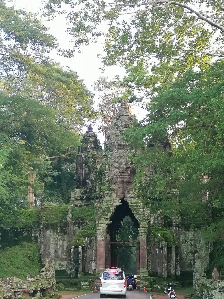 Ich klettere voller Ehrfurcht wieder auf mein Fahrrad und fahre die Straße weiter entlang nach Norden. Dort passiere ich wieder eines der großen Tore mit dem Wächtergesicht über dem Bogen in ganz groß. Dahinter kommt die zweite große Attraktion: Der Bayon-Tempel: