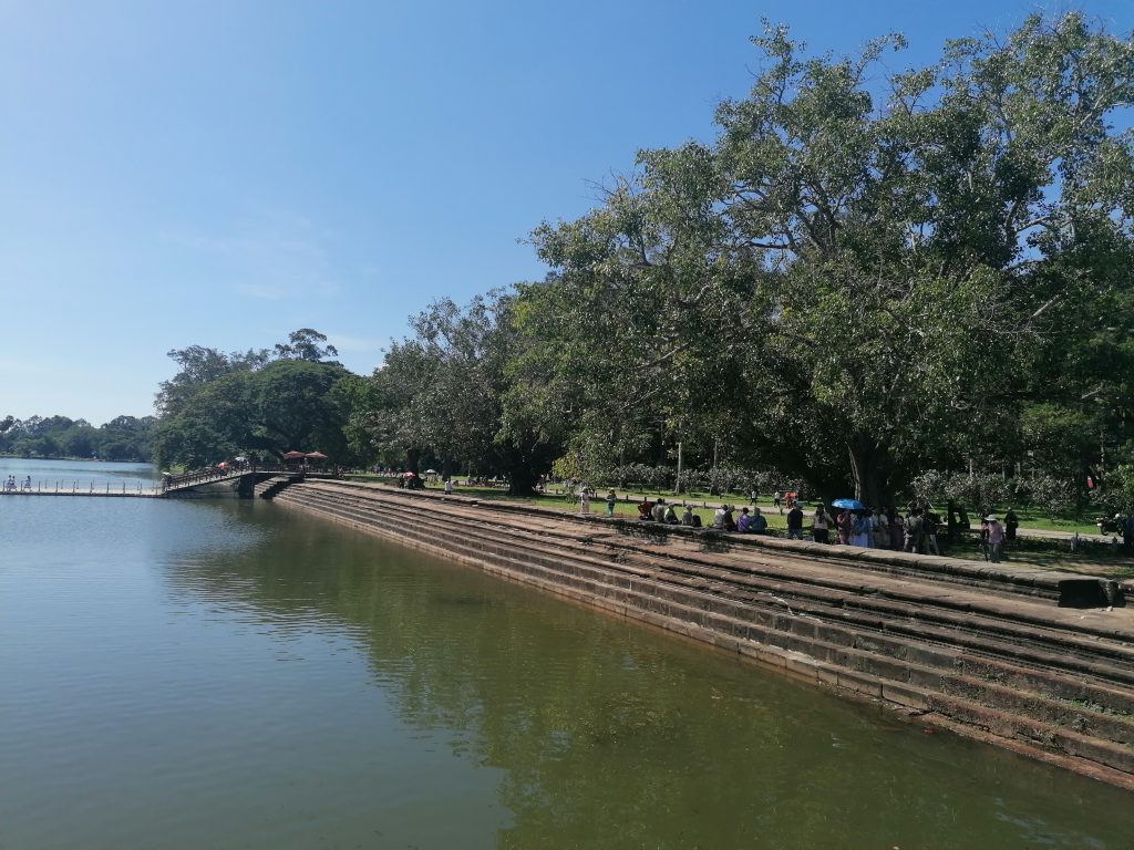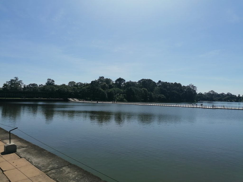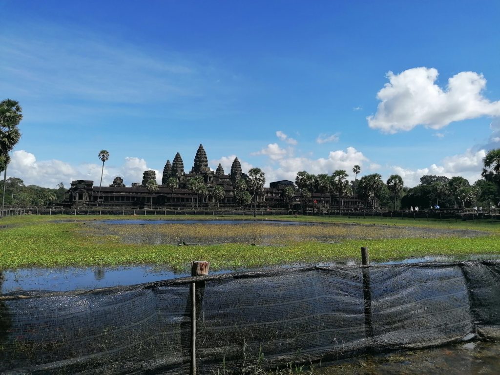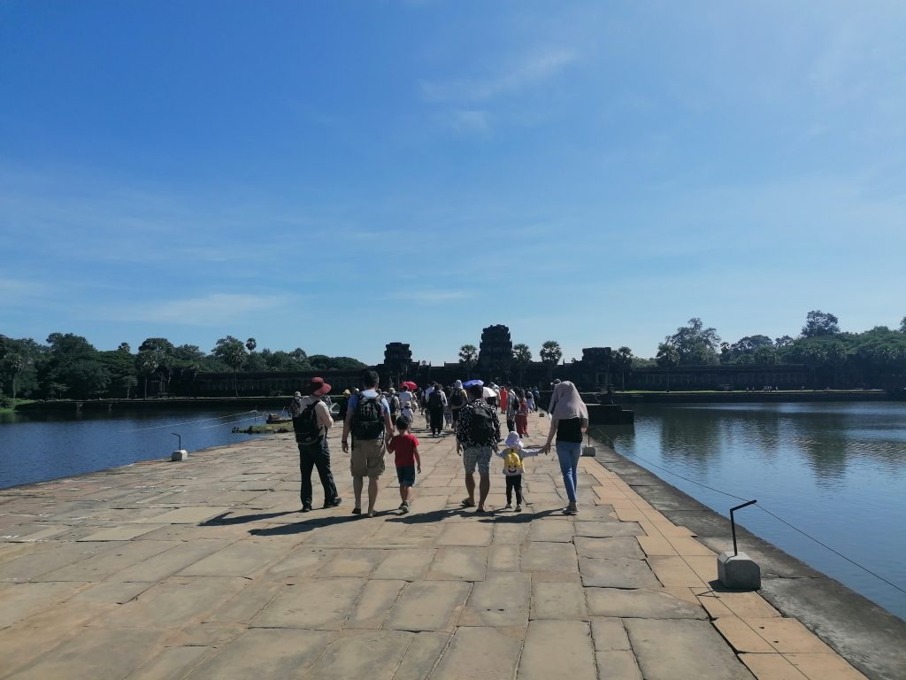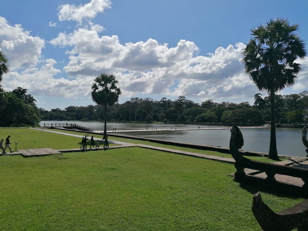 Vor der großen Brücke zeige ich mein Ticket und gehe dann los. Angkor Wat selbst ist einem großen, künstlichen See umgeben und von einem Vorbau, wahrscheinlich einer Bewachungsanlage. Das allein ist schon eindrucksvoll