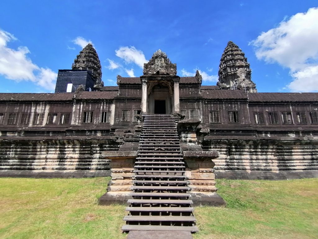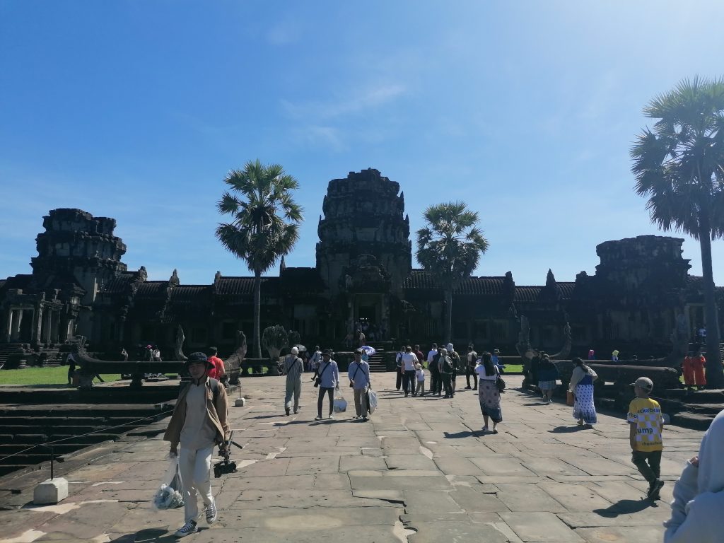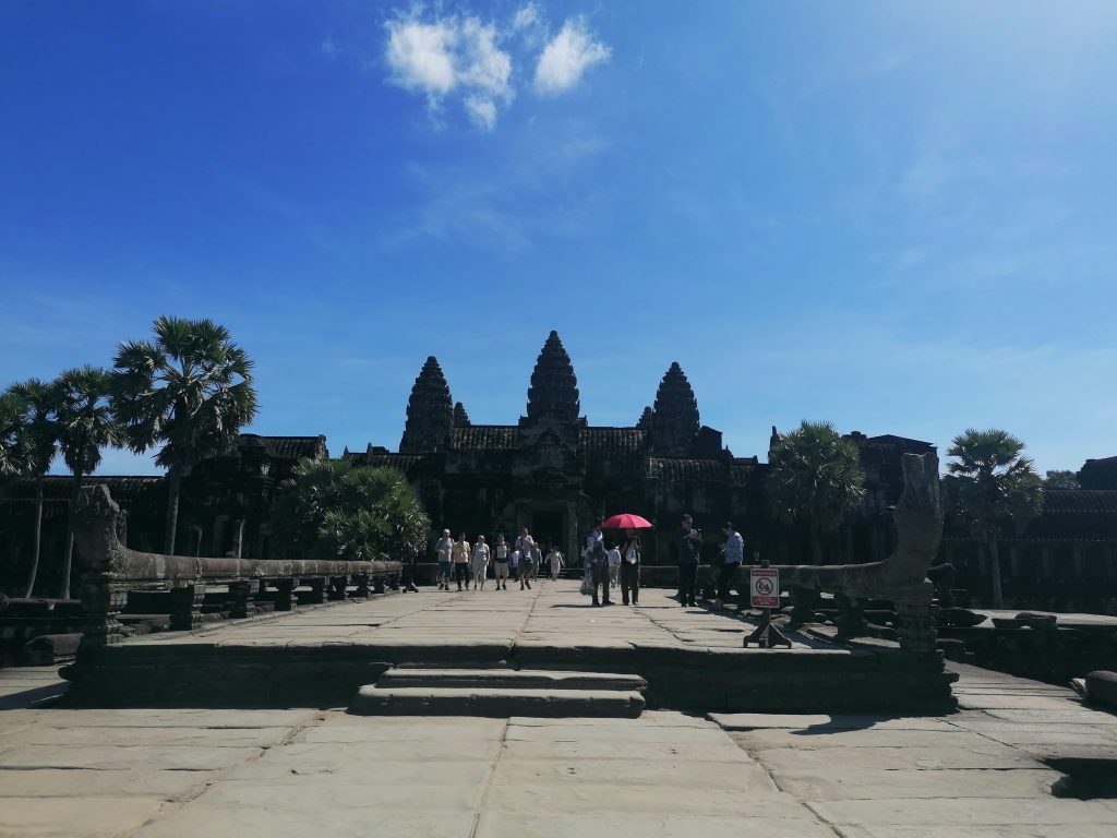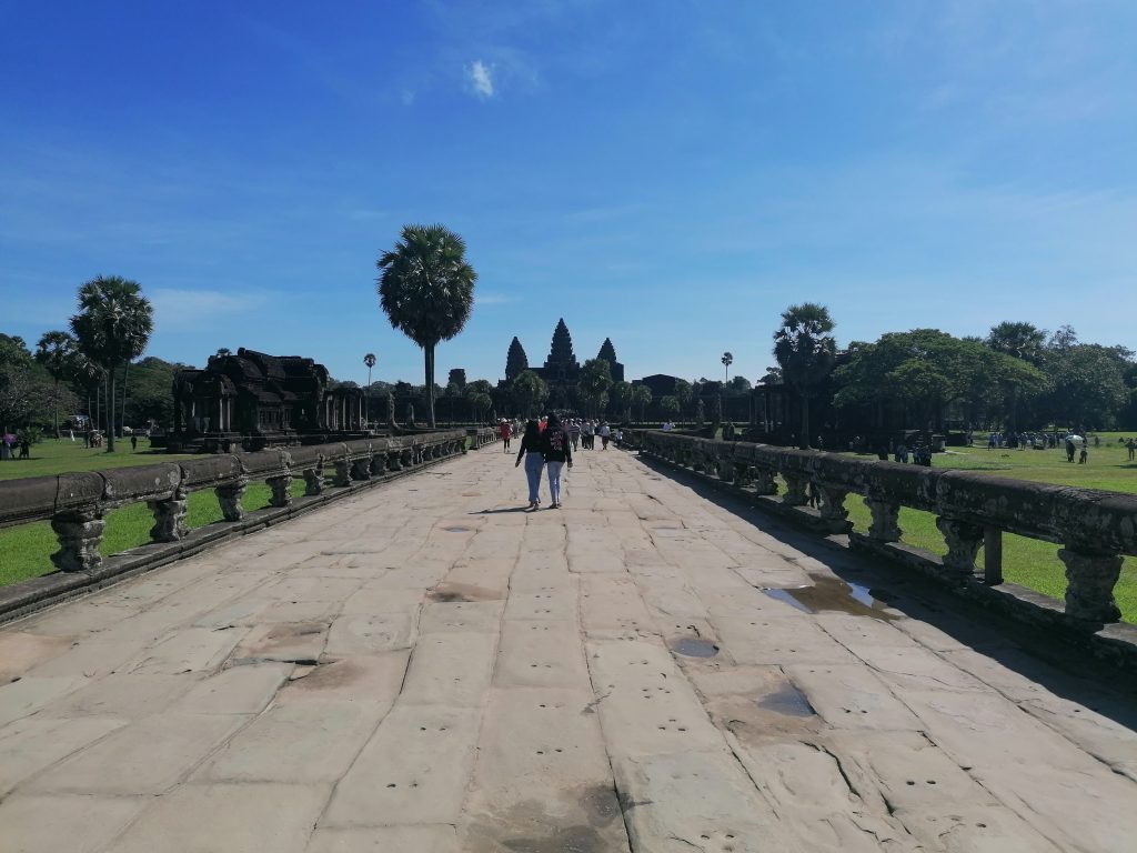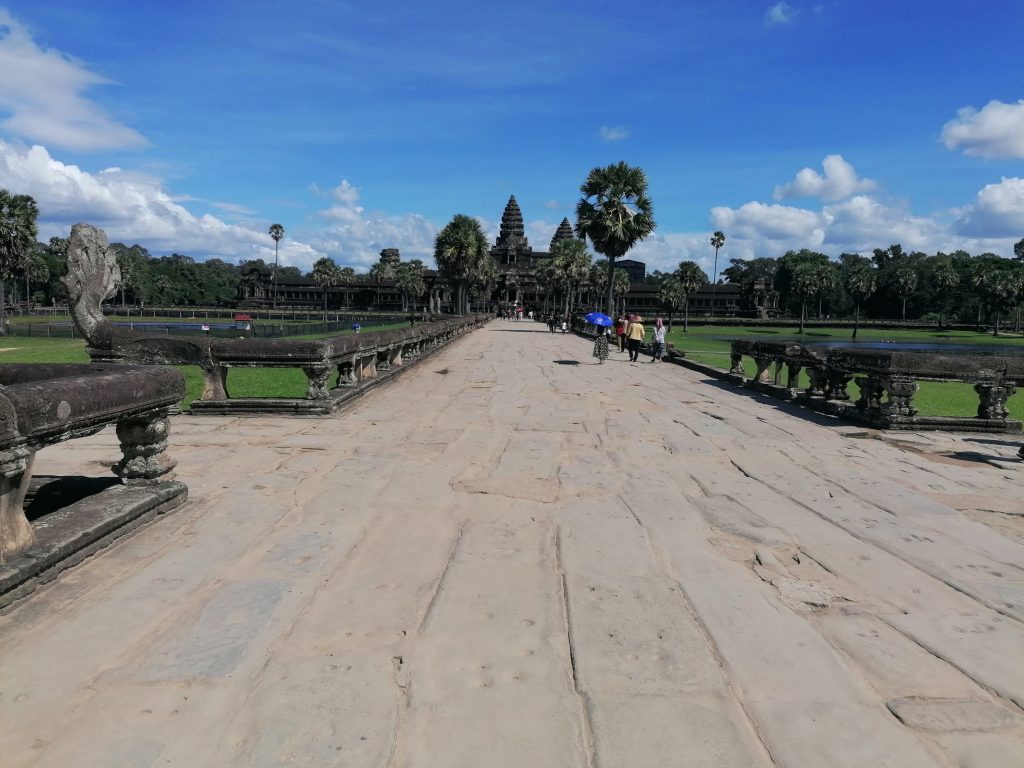 Hinter dem Wachgang öffnet sich ein riesiges Gelände… und in der Mitte steht der majestätische Tempel mit den fünf Türmen: Angkor Wat, der Haupttempel.