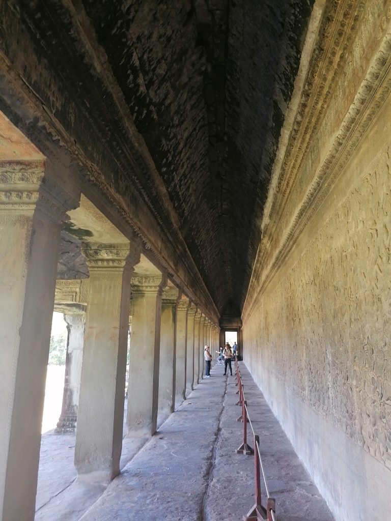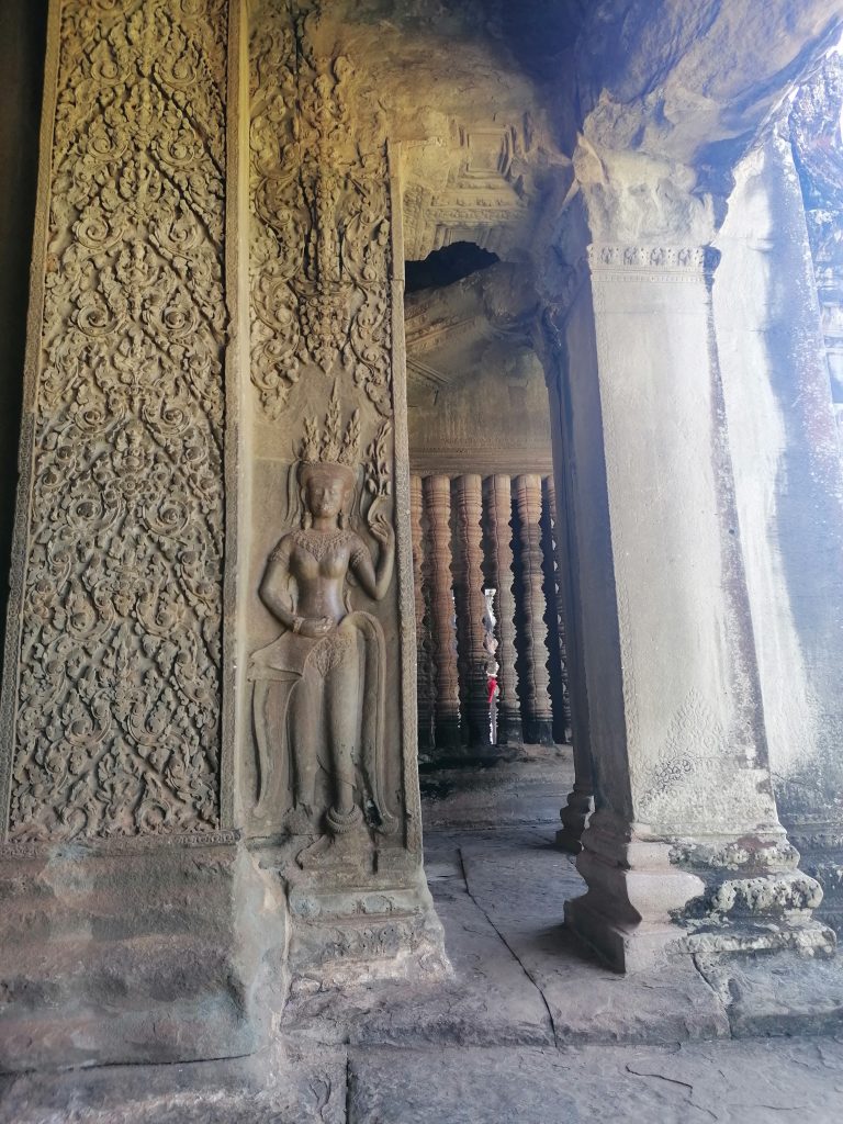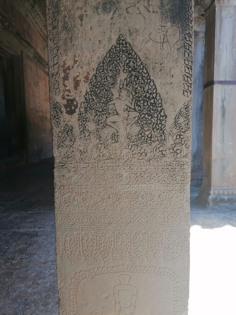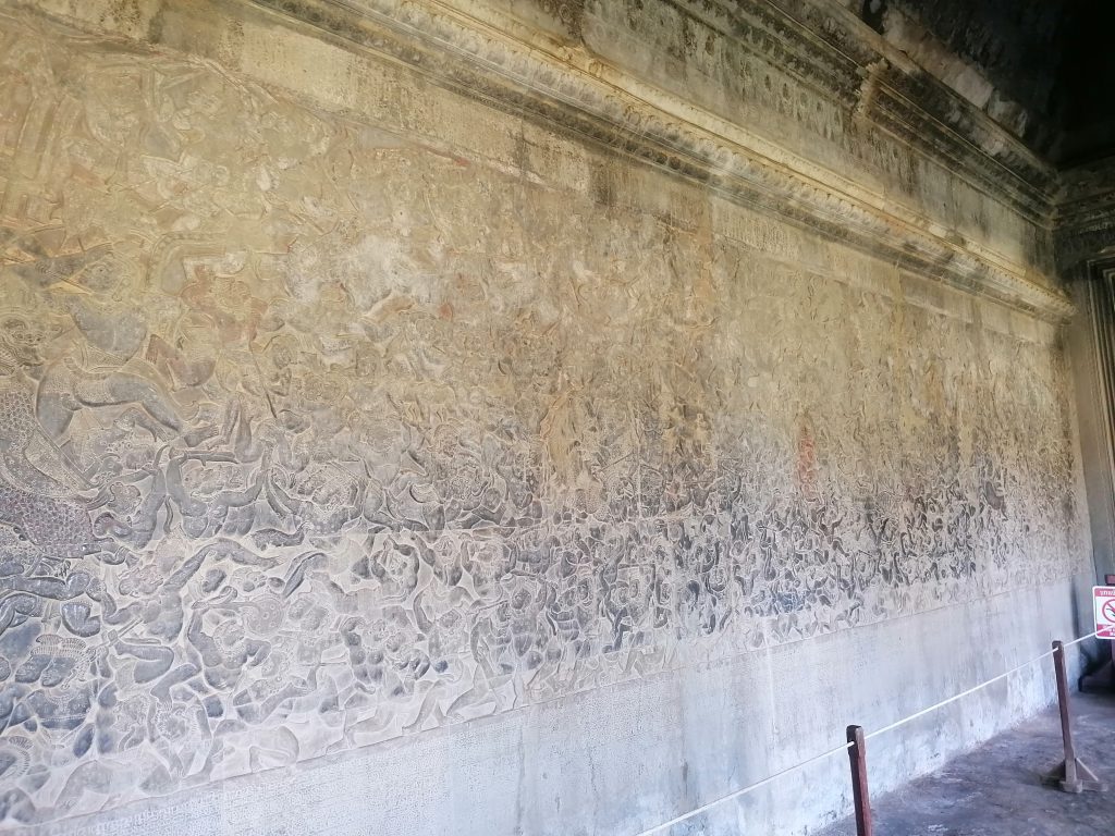 Um das Jahr 802 wird mit Javayarman II. der erste König eines Reiches gekrönt, das das einflussreichste in ganz Südostasien sein wird: Das Volk der alten Khmer entsteht. Dieses Reich ist all seinen Vorgängern und den meisten seiner Nachfolger in Wirtschaft, Militär und Kultur um vieles Überlegen. Kambodscha ist heute nur noch ein kleiner Teil des Riesenreiches, das sich einst über Thailand, Laos und Teile von Vietnam erstreckt hat. In seiner Hochzeit (11.-13 Jh) lässt König Suryavarman II. eine Tempelstadt erbauen, die ihres gleichen noch heute sucht: Angkor Wat. „Angkor“ bedeutet Hauptstadt, „Wat“ bedeutet Tempel. Die Stadt wurde nach der entsprechenden Religion im hinduistischen Stil gebaut. Die Verzierungen, die ich so bewundere sind Bilder von hinduistischen Gottheiten oder Symbole der Religion, manchmal Krieges-/Siegeszüge.
