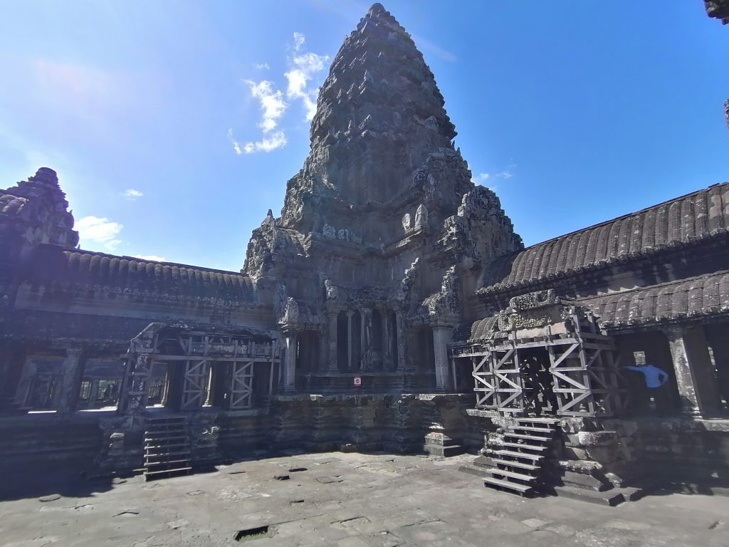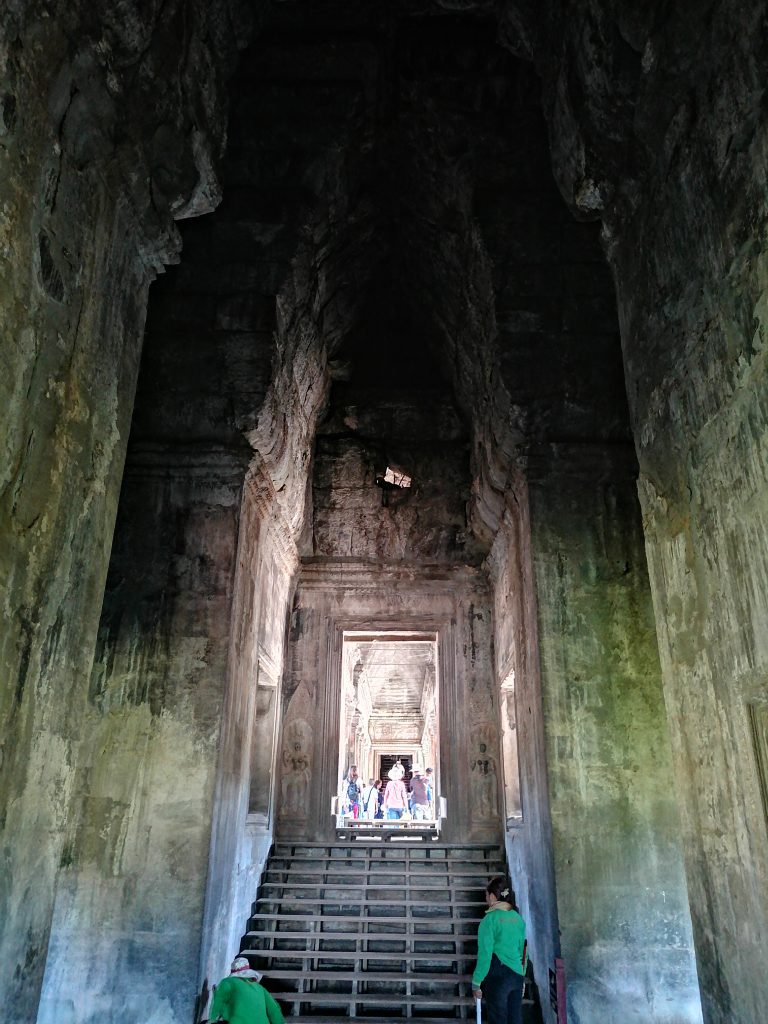 Nachdem ich den Tempel betreten habe, schaue ich mich zuerst in ein paar ruhigeren Ecken und Gängen genauer um, bevor ich dem Touristenstrom bis ins Herz der Anlage folge. Der zentrale Turm bildet das Herzstück, die vier anderen Türme sind quadratisch als Eckpfeiler um den mittleren herumgebaut, verbunden durch Gänge, alles in exakter Symmetrie und sehr detaillreich ausgeschmückt.