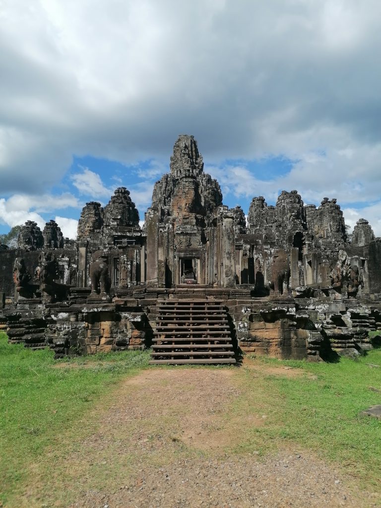 Der Tempel unterscheidet sich ein bisschen von der Struktur der anderen, ist komplexer gebaut, eher rund statt quadratisch. Auch die Säulen an den Rändern anstatt den Mauern sind anders. Aber das auffälligste Merkmal sind die „lächelnden“ Gesichter-Türme, deren Ursprung und Bedeutung umstritten sind.