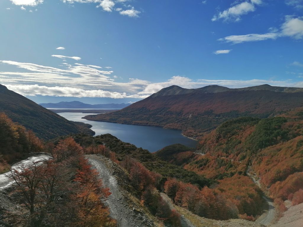 Jorge ist ganz begeistert, dass ich einen eigenen Mate habe und er ist der Erste, mit dem ich Mate aus meinem eigenen Mate teile. Mate aleman, deutscher Mate. Auch für ihn ein erstes Mal. Jorge lebt in Ushuaia und hat zusammen mit seinen Geschwistern viele Hektar Land vor der Stadt, auf dem die Rinder grasen. Ich bin mal wieder platt, als er mir die Zaungrenzen zeigt, an denen wir vorbeifahren. Es ist riesig. Kurz hinter der Stadt hält er kurz an, damit ich ein Foto vom Aussichtspunkt auf den Lago Fagnano machen kann.