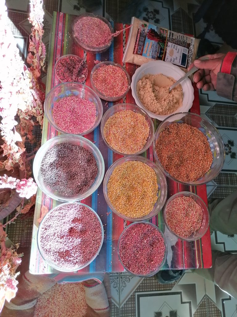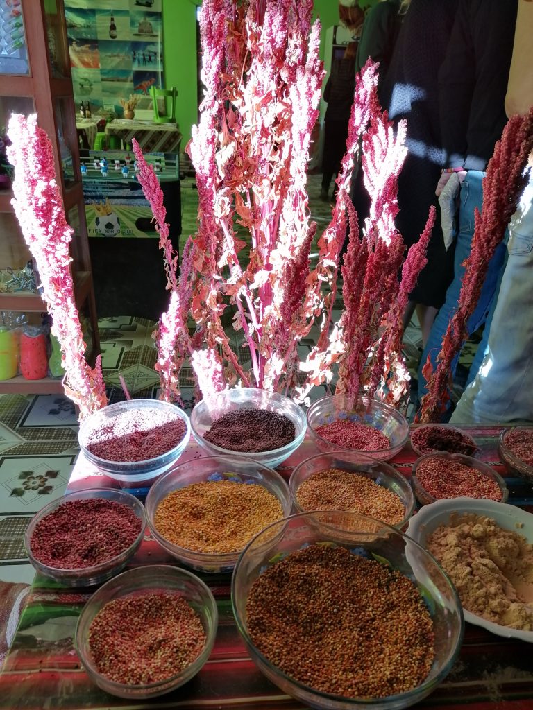 Ich versuche viel Tee zu trinken, weil ich momentan mal wieder so richtig schlecht Wasser trinke. Der Tag ist zu Ende und meine Literflasche immer noch halb voll. Die Salzwüste ist natürlich ein super Ort dafür. Gegen acht Uhr geht es los. Unser erster Stopp ist in einem nahegelegenen Ort, wo es einen Kiosk und eine kleine Quinoa-Ausstellung gibt. Während der Großteil der Reisegruppen sich mit Snacks eindeckt, erklärt uns der Guide, dass es hier 30 verschiedene Quinoa-Sorten gibt. Ein paar davon sind hier ausgestellt, zum Beispiel der gelbe, der rote, der rosane, der weiße oder der schwarze.