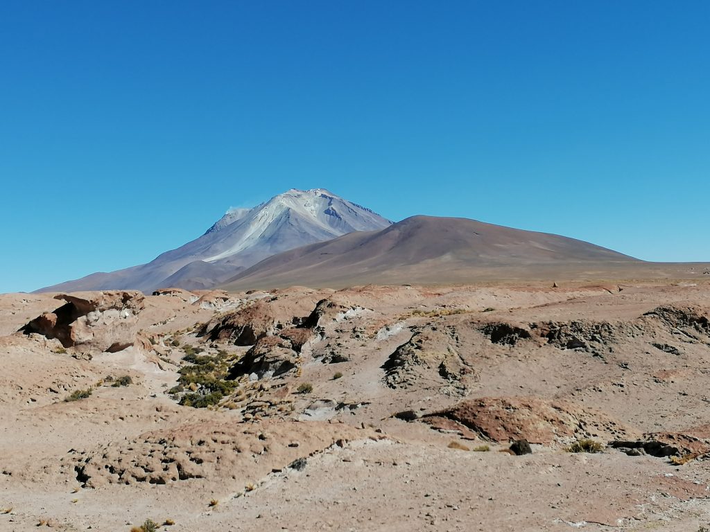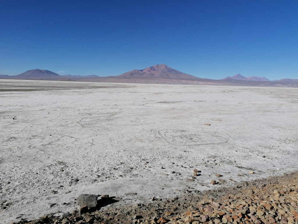 Der nächste Halt ist der Aussichtspunkt für den Vulkan Ollagüe, auf 4200 Meter Höhe. Weit in der Ferne sieht man eine Rauchwolke aus dem Berg aufsteigen. Wir haben wieder ein bisschen Zeit, was mich freut, ich nutze jede Gelegenheit, um mir die Beine zu vertreten. So langsam tun mir schon die Knie weh, weil wir hinten so eingequetscht sitzen und nie die Beine ausstrecken können.