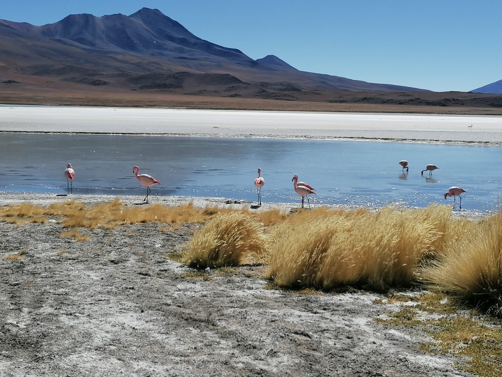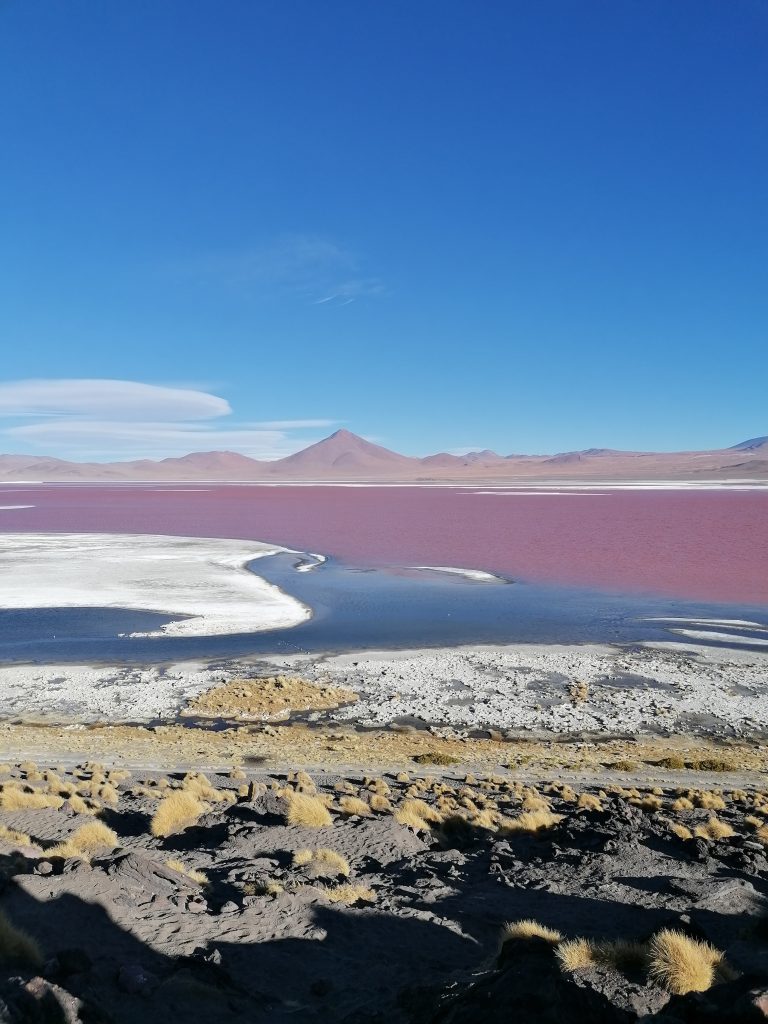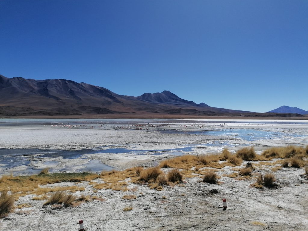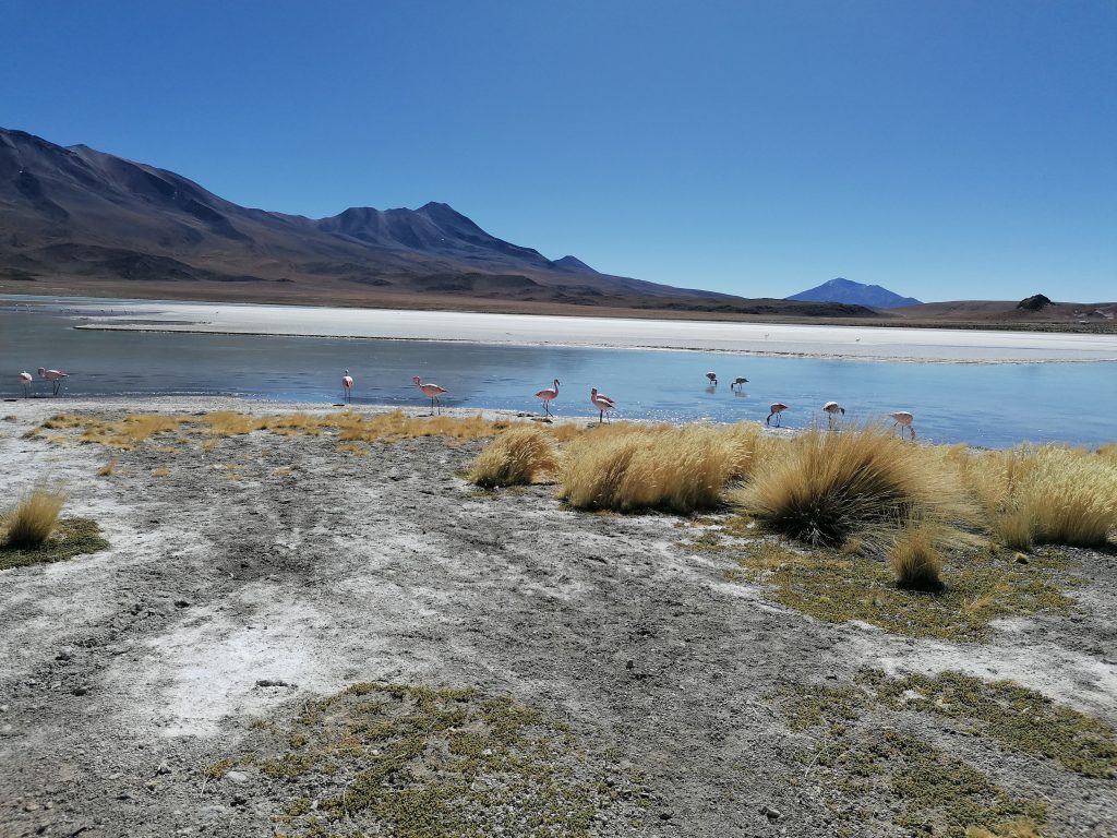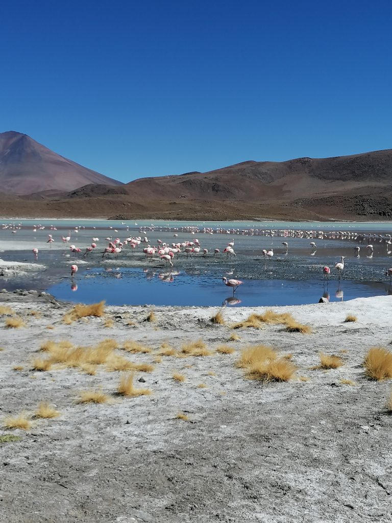 Dann beginnt unser Lagunen-Marathon. Den Namen der ersten hab ich wieder vergessen. Der Guide lässt uns am Anfang eines kleinen Spazierwegs an der Lagune entlang raus und holt uns am anderen Ende ab. Zur Erklärung, wir sind immer mit den beiden Jeeps unterwegs, wir sind getrennt, aber theoretisch eine Gruppe. Ale und ich beginnen zu spazieren. Das Ufer ist salzig weiß und gelb-grün bewachsen, die Lagune eisblau… mit rosa Punkten.