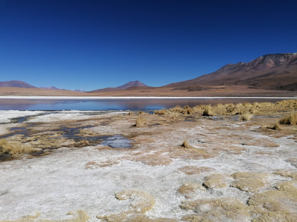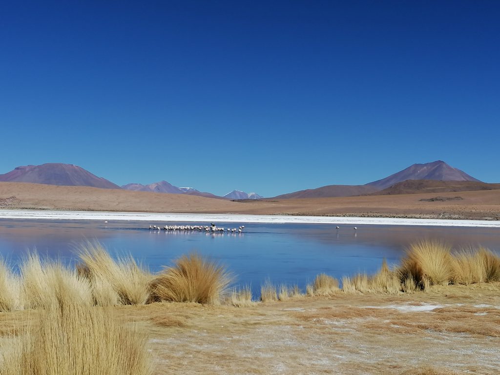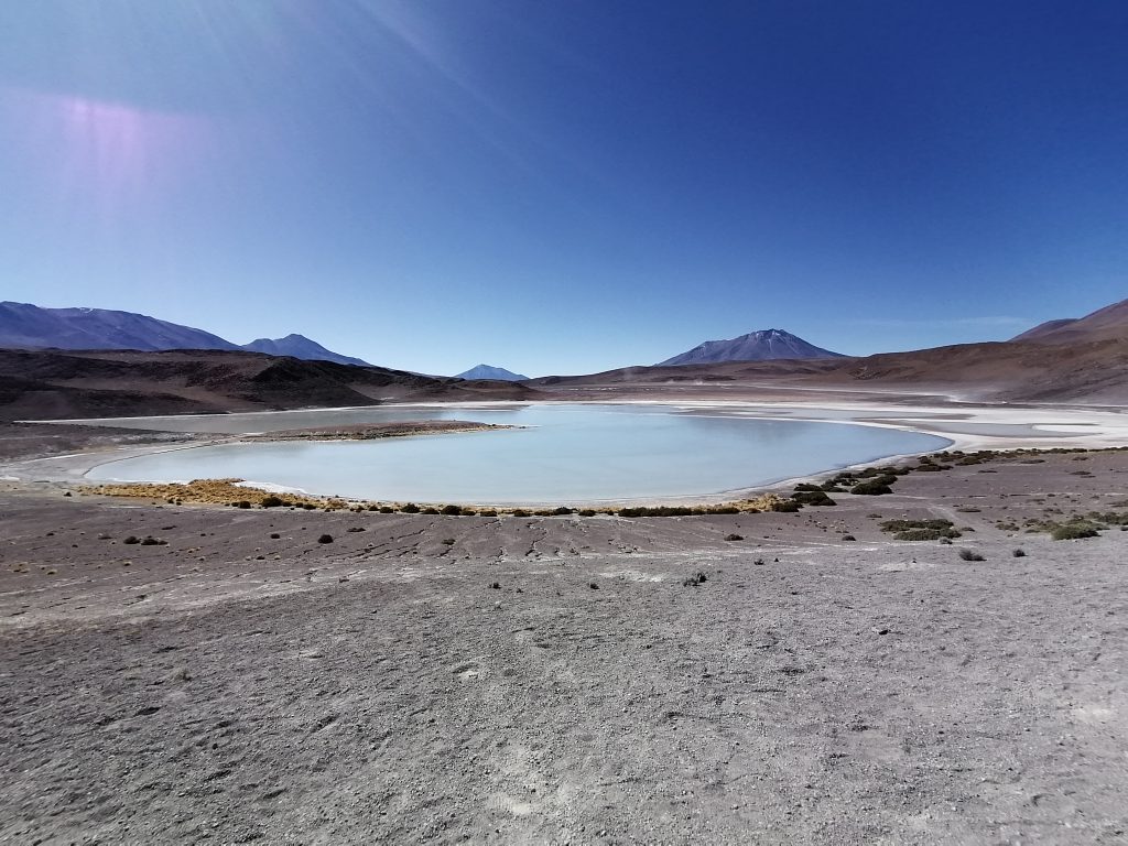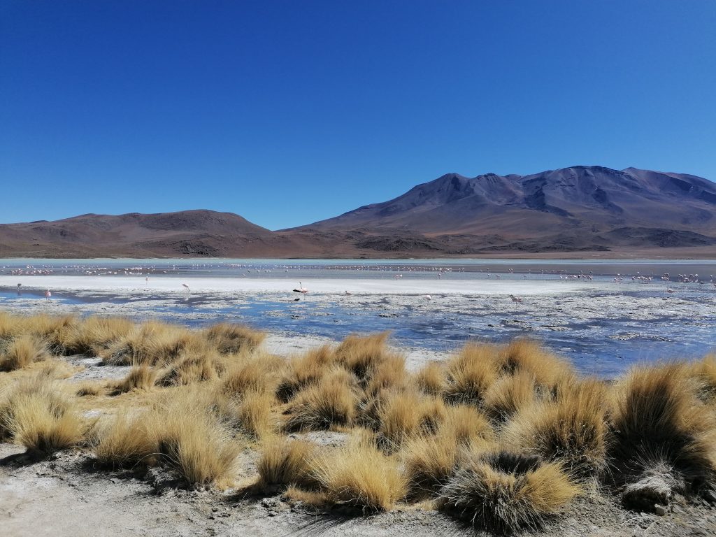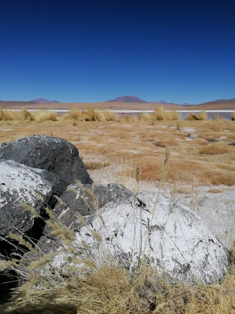 Dann beginnt unser Lagunen-Marathon. Den Namen der ersten hab ich wieder vergessen. Der Guide lässt uns am Anfang eines kleinen Spazierwegs an der Lagune entlang raus und holt uns am anderen Ende ab. Zur Erklärung, wir sind immer mit den beiden Jeeps unterwegs, wir sind getrennt, aber theoretisch eine Gruppe. Ale und ich beginnen zu spazieren. Das Ufer ist salzig weiß und gelb-grün bewachsen, die Lagune eisblau… mit rosa Punkten.