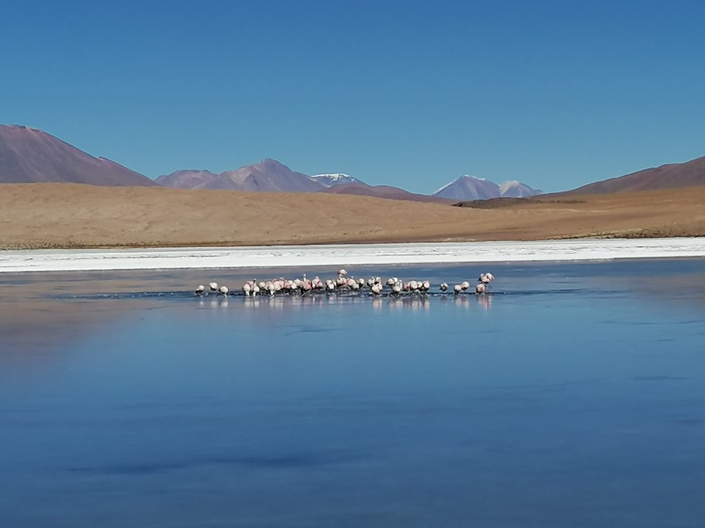 Für Ale ist es das erste Mal, dass sie Flamingos in freier Wildbahn sieht, sie findet es genauso toll wie ich. Sogar eine Vicuñaherde ist in der Ferne zu sehen, wie sie sich dem Wasser nähert.