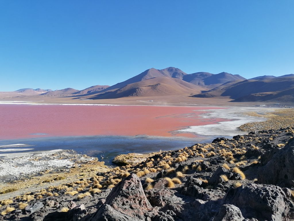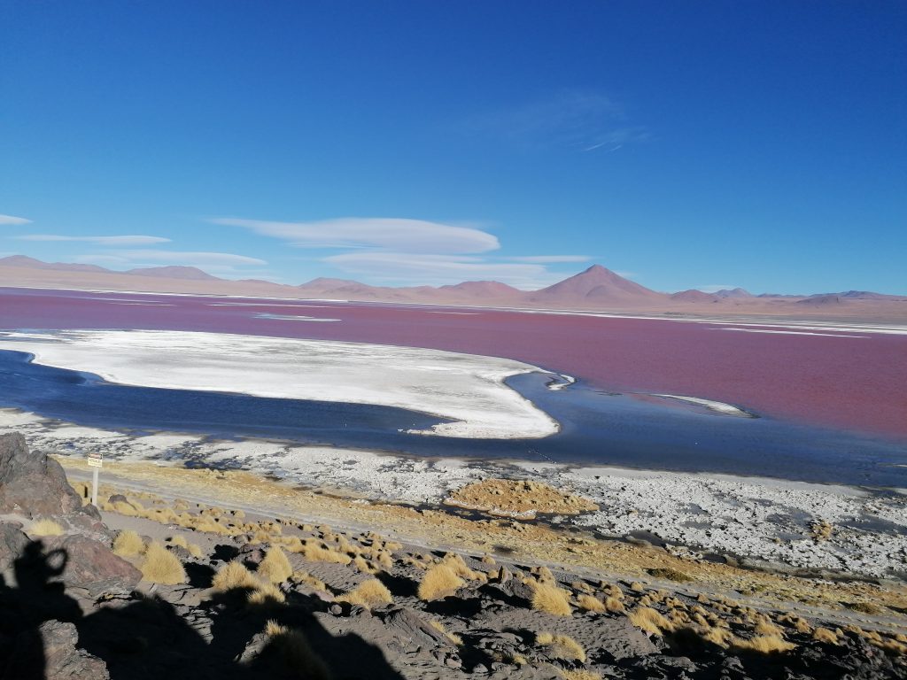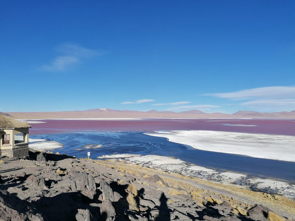 Wir fahren weiter zur Laguna Colorada, eines der Haupthighlights neben der Salzwüste. Der Aussichtspunkt liegt auf einem Hügel über der Lagune, die rosarot im Sonnenlicht glitzert.