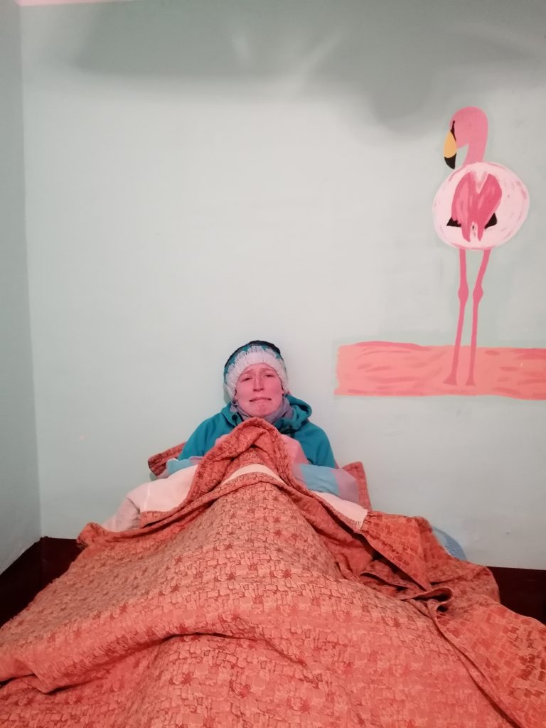 Während des Essens erzählen Ale und ich, dass uns so kalt war, da antwortet die andere Deutsche, mit dem Schlafsack geht es bei ihr. Achso, ihr habt richtige Schlafsäcke dabei – Nee, nee, die haben wir von der Agentur bekommen….