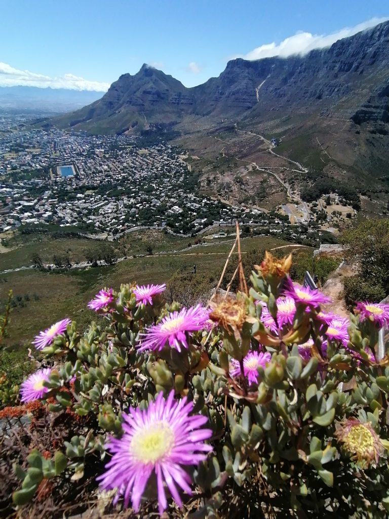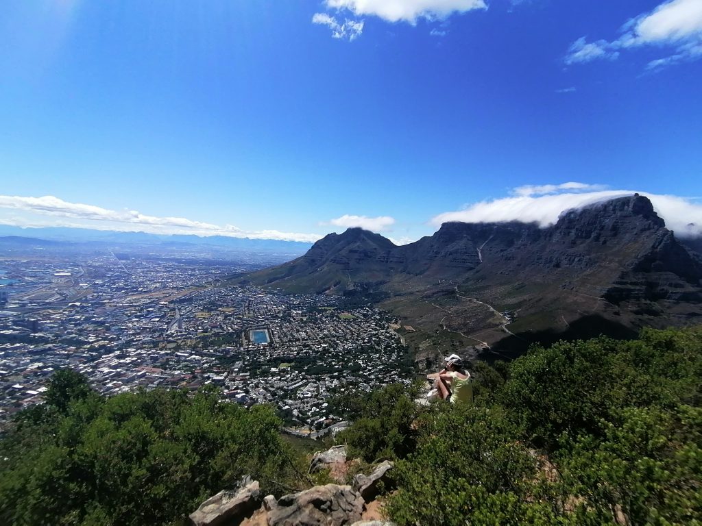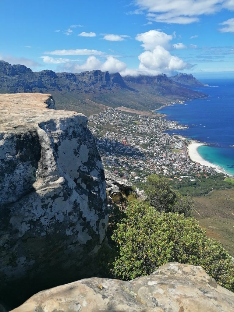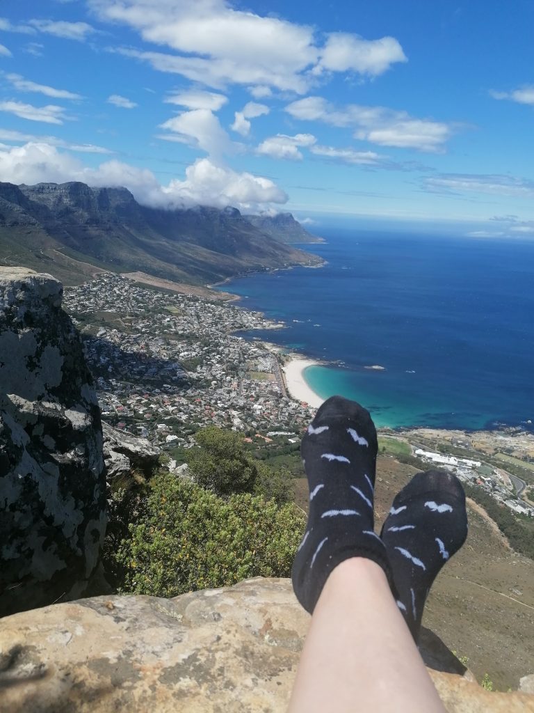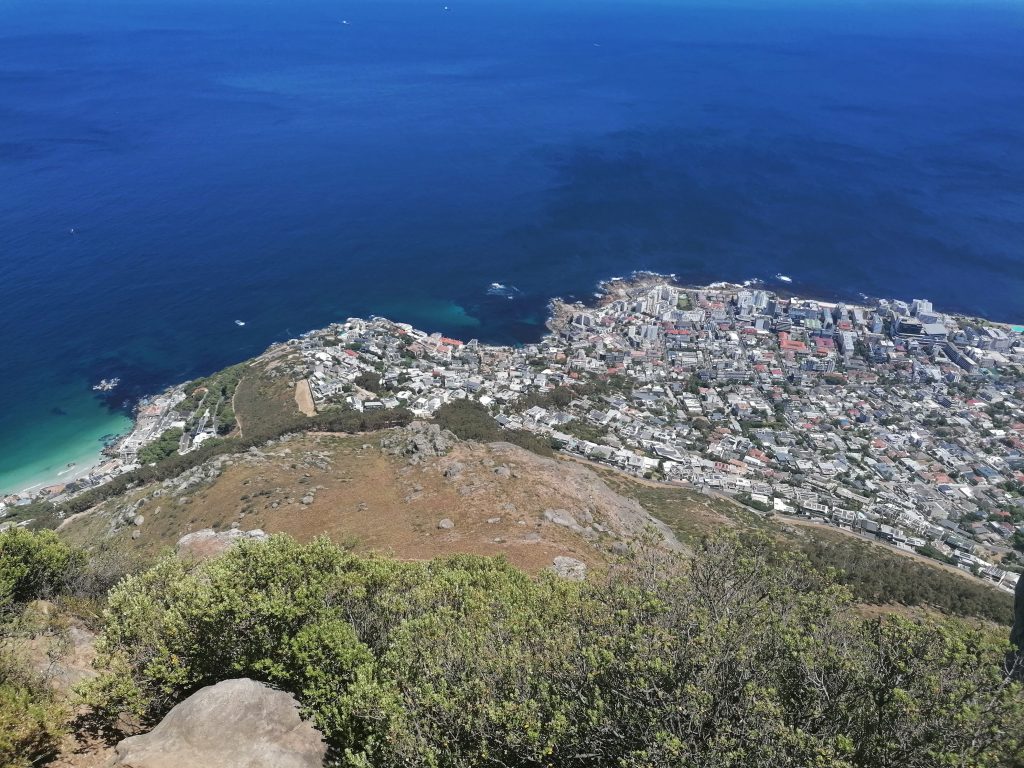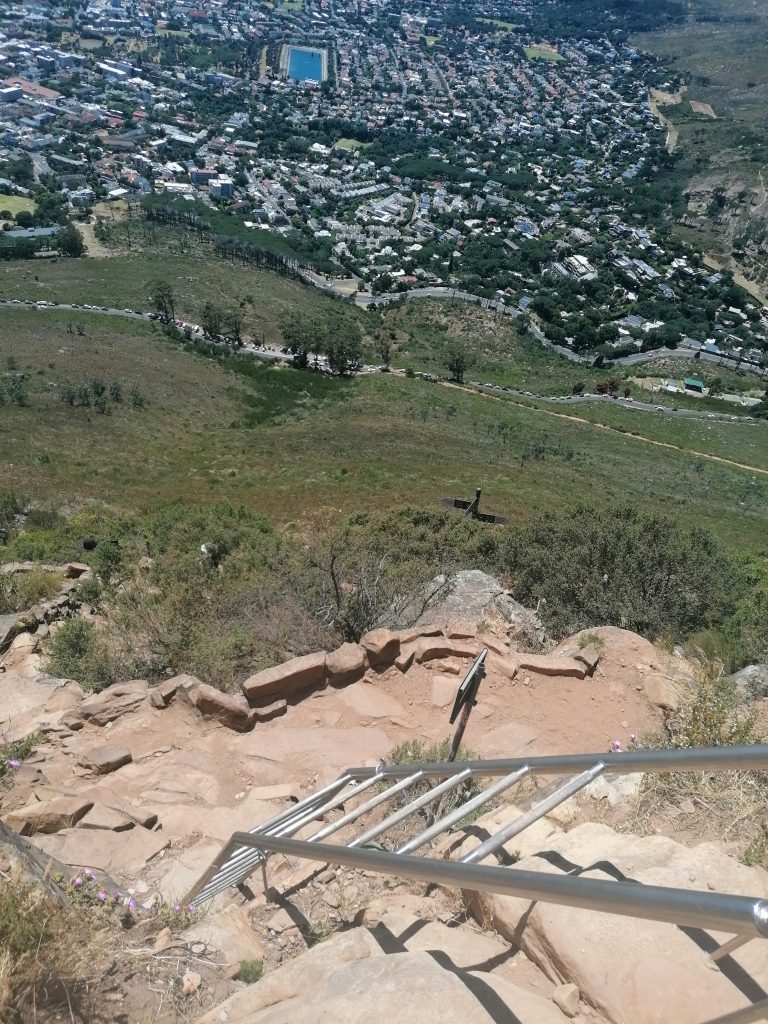 Die Berge hier sind wieder ganz anders, als die, die ich bisher gesehen habe. Man sieht genau die verschiedenen Ebenen, in denen der Berg gewachsen war, beziehungsweise sieht es so aus, als würden diese langsam, herunterbröckeln. Als hätte man Platten aufeinandergelegt, die nach oben hin schmäler würden. Zwischen durch sind wieder grüne Flächen, bevor wieder eine neue „Steinterrasse“ herausragt. Ich beschließe, mich bei Gelegenheit mit der Geologie der südafrikanischen Berge zu beschäftigen. Aber dort oben suche ich mir erstmal einen ruhigen „Balkon“, eine Ecke für mich, wo ich die Schuhe ausziehe, und die Füße baumeln lasse, während ich auf die Blautöne des Ozeans, die weißen Strände, die Stadt und die Berge daneben in Ruhe betrachte und genieße. Später finde ich noch jemanden, der ein paar tolle Fotos von mir macht, auf einer Steinplattform am vorderen Teil des Berges. Dort sieht es aus, als würde man direkt über der Stadt schweben. Guter Punkt, wird aber auch gut genutzt.