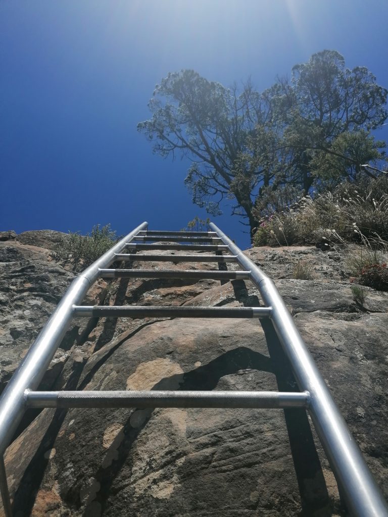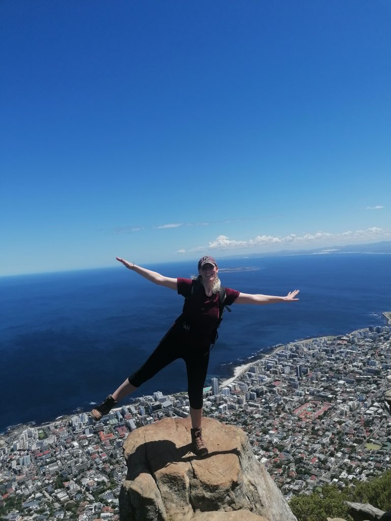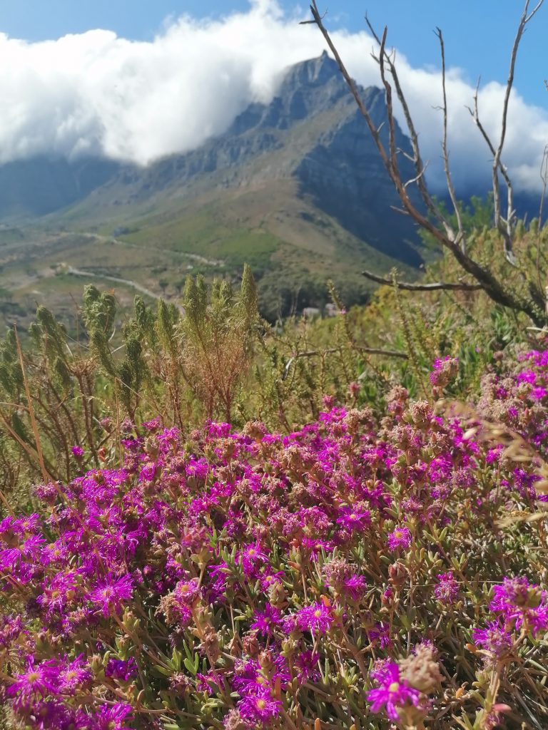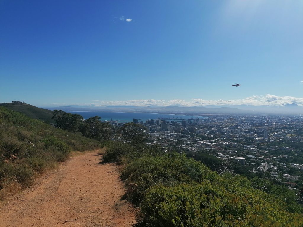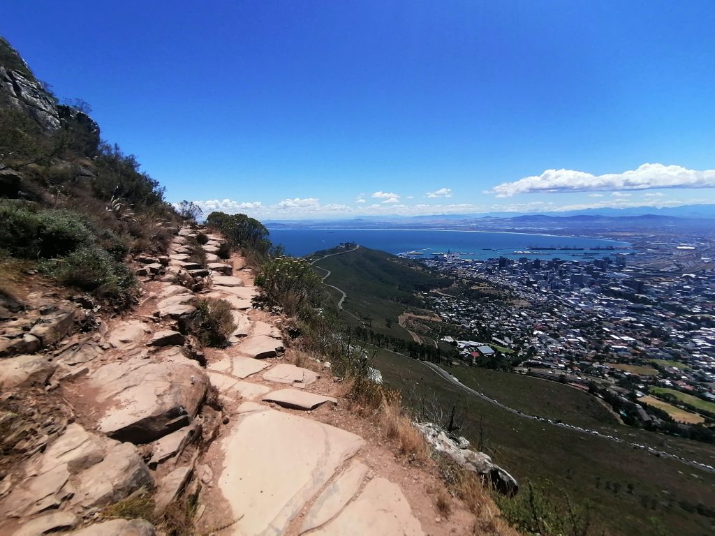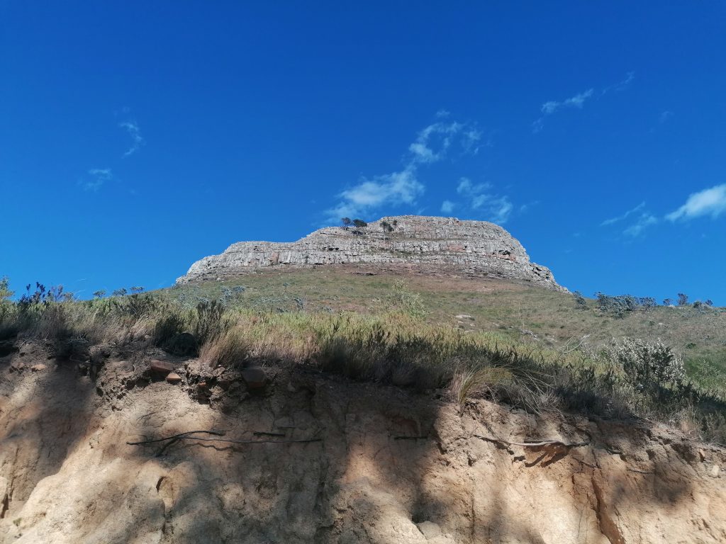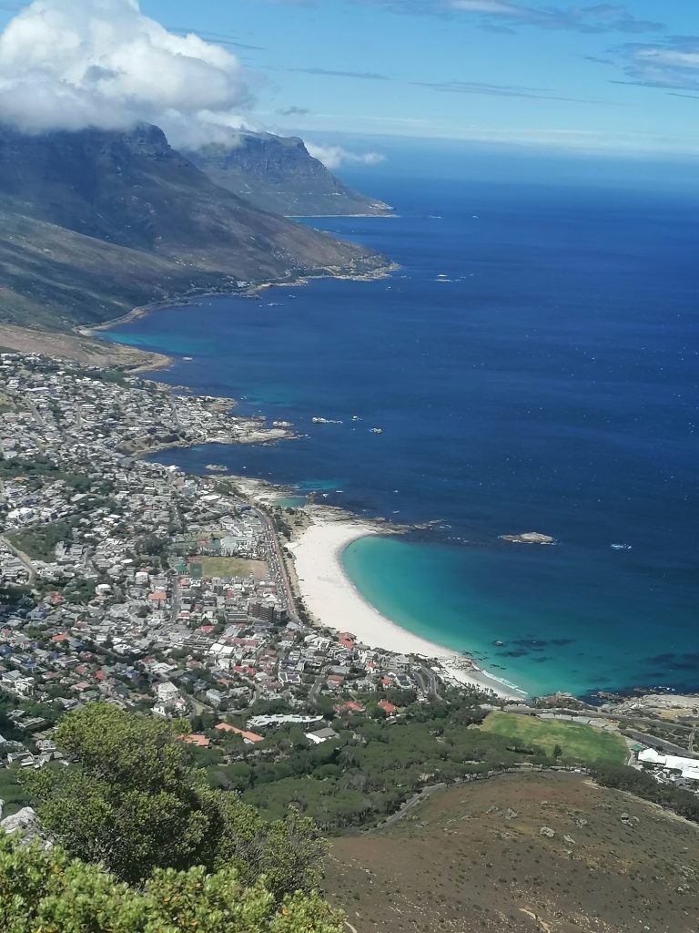 Die Berge hier sind wieder ganz anders, als die, die ich bisher gesehen habe. Man sieht genau die verschiedenen Ebenen, in denen der Berg gewachsen war, beziehungsweise sieht es so aus, als würden diese langsam, herunterbröckeln. Als hätte man Platten aufeinandergelegt, die nach oben hin schmäler würden. Zwischen durch sind wieder grüne Flächen, bevor wieder eine neue „Steinterrasse“ herausragt. Ich beschließe, mich bei Gelegenheit mit der Geologie der südafrikanischen Berge zu beschäftigen. Aber dort oben suche ich mir erstmal einen ruhigen „Balkon“, eine Ecke für mich, wo ich die Schuhe ausziehe, und die Füße baumeln lasse, während ich auf die Blautöne des Ozeans, die weißen Strände, die Stadt und die Berge daneben in Ruhe betrachte und genieße. Später finde ich noch jemanden, der ein paar tolle Fotos von mir macht, auf einer Steinplattform am vorderen Teil des Berges. Dort sieht es aus, als würde man direkt über der Stadt schweben. Guter Punkt, wird aber auch gut genutzt.