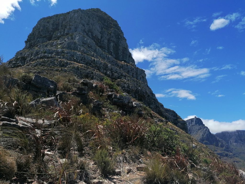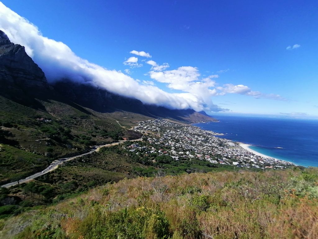 Kapstadt hat zwei berühmte Gipfel, die über die Stadt ragen und das Panorama unvergleichlich machen. Links von mir schiebt sich das beeindruckende Bergmassiv in die Höhe, dessen platter Gipfel mystisch in den Wolken hängt, wie es üblich ist: Der Tafelberg. Dort werde ich in den nächsten Tagen auch noch hinkommen.