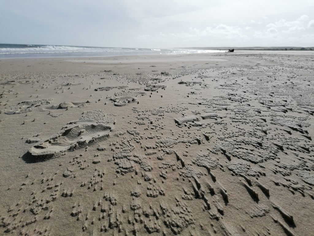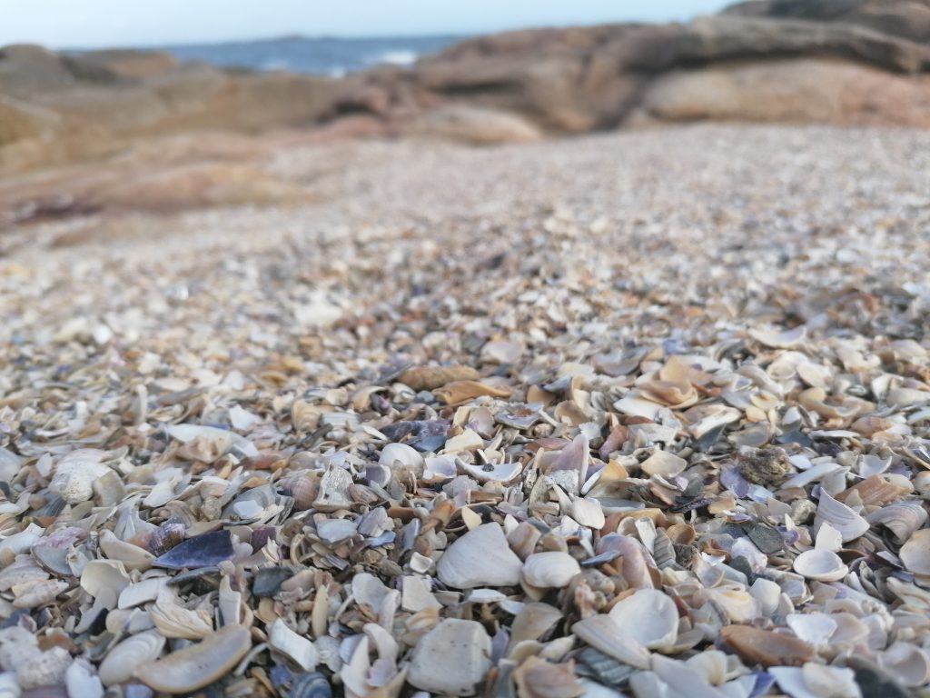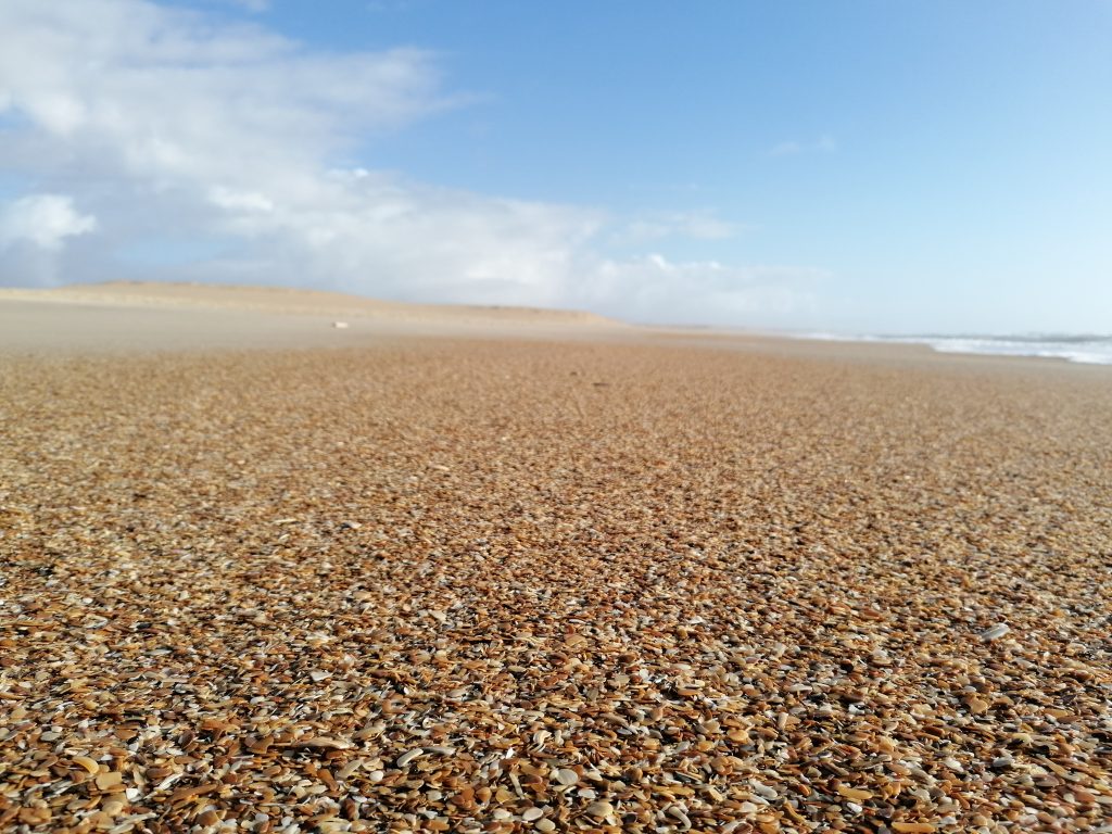 Am Strand ist es besser, dort ist der Sand stabil. Einmal um die Landzunge des Leuchtturms herum und dann hört man sie sie heulen, die Seehunden. Und man riecht sie auch. Und wie… oh wow, da verzieh sogar ich das Gesicht. Mir fällt auf, dass hier streckenweise die Strände nur aus Muschelschalen bestehen. Wahnsinn!