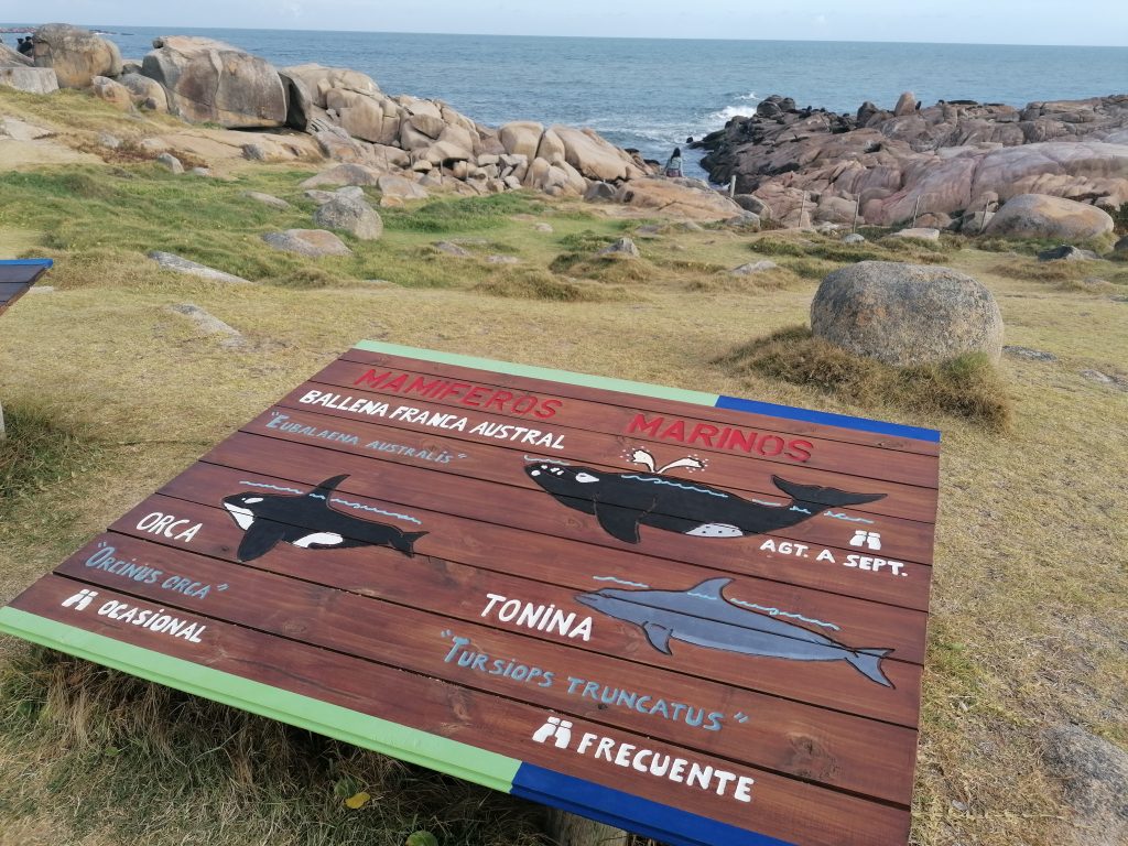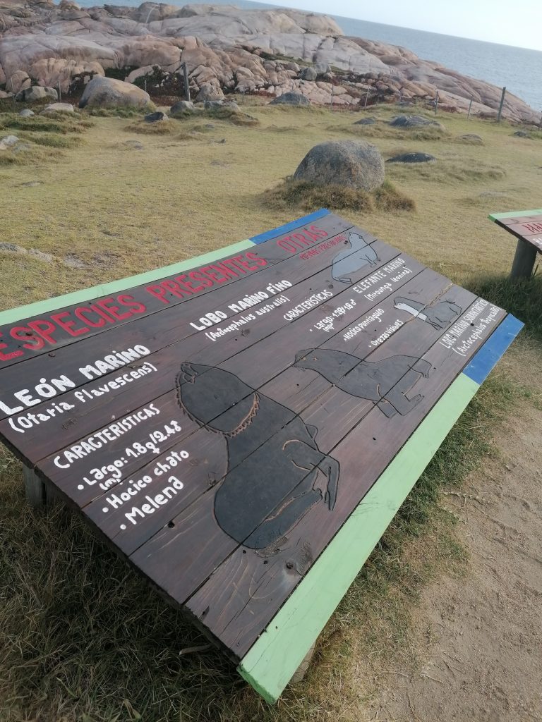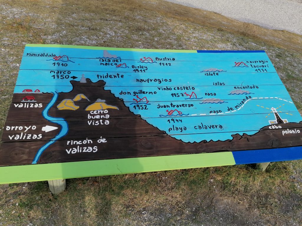 Ich komme auch an einem weiteren Infoschild an, das sämtliche der Felsinseln zeigt, auf denen die Seehunde liegen… und die Schiffe, die dort gesunken sind. Das ist also der echte „Punta del Diablo“.