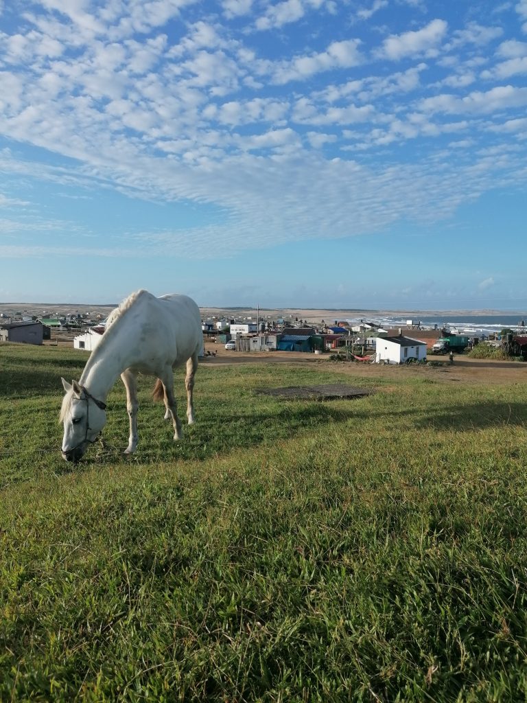Aber zuerst noch ein bisschen spazieren. Der Wind hier ist noch stärker als die letzten Tage in Punta del Diablo. Der Sand zieht über den Boden und beißt mich in die Waden. Die Luft ist so salzig, dass meine Haare sofort zusammenkleben, auch gleich nach einer Dusche. Der Sand ist fast weiß und als ich der Sonne entgegenlaufe wirkt es, als wäre ich in einem Schwarz-weiß Film, alle Farbe ist verschwunden. Es ist schön und schaurig zugleich. Was für ein Ort, um sich inspirieren zu lassen.