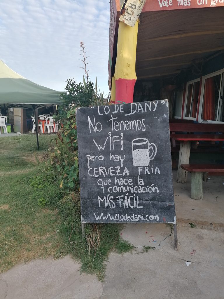 Auf dem Schild steht: Wir haben kein WLAN, dafür kaltes Bier, das macht das Gespräch einfacher. Auch den „Viejo Lobo“-Pub – „Der alte Seehund“ – finde ich sehr sympathisch.