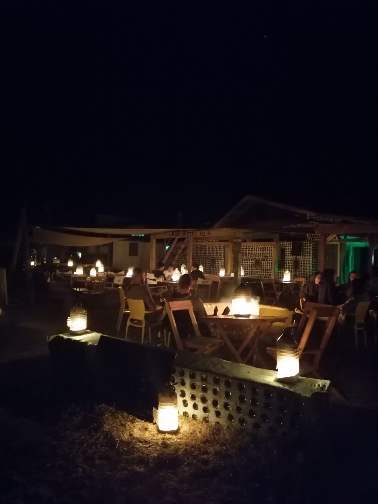 Aber der Magen brummt und Tom und ich ziehen los, um etwas zu essen. Es gelüstet uns nach Fisch, wir fragen nach und ein Restaurant serviert heute Hai…okay, warum nicht? Ich bestelle meinen Hai mit Orangensauce und Kartoffelpürree. Hai schmeckt sehr fleischig und ist sehr grob, es bleibt also viel Knorpel auf dem Teller zurück. War nicht schlecht, aber ich brauch’s auch nicht nochmal. Der Weißwein dazu war bescheiden. Wir spülen noch mit einem Caipirinha hinterher und gehen dann zurück zum Hostel. Der Sternenhimmel ist heute bedeckt, gut, dass ich ihn gestern gesehen habe. Nur der Leuchtturm blinkt weiter zuverlässig im 12-Sekunden-Takt. Tom und ich verabschieden uns und ich muss ihm versprechen, Black Mirror zu gucken. Okay, Hand drauf. Wieder eine besonders schöne Begegnung im Hostel. Ich mag das wirklich gern.