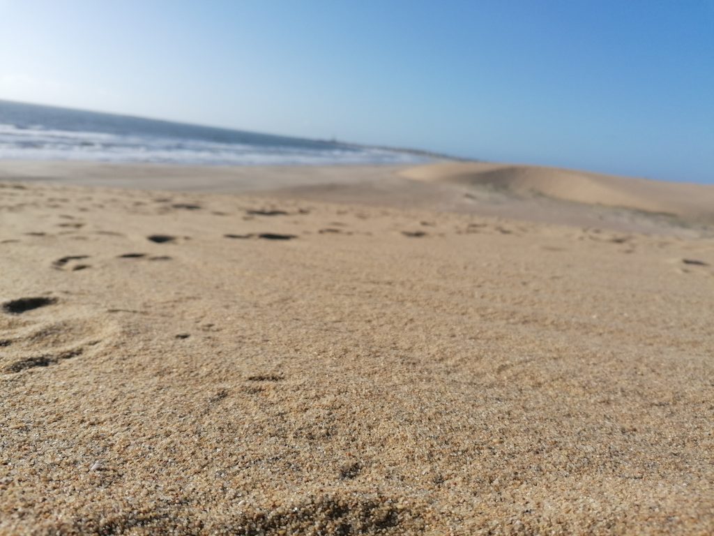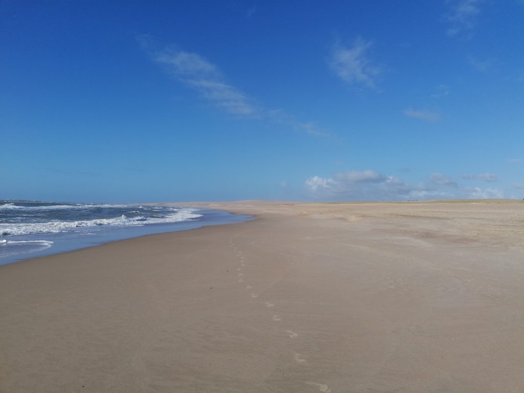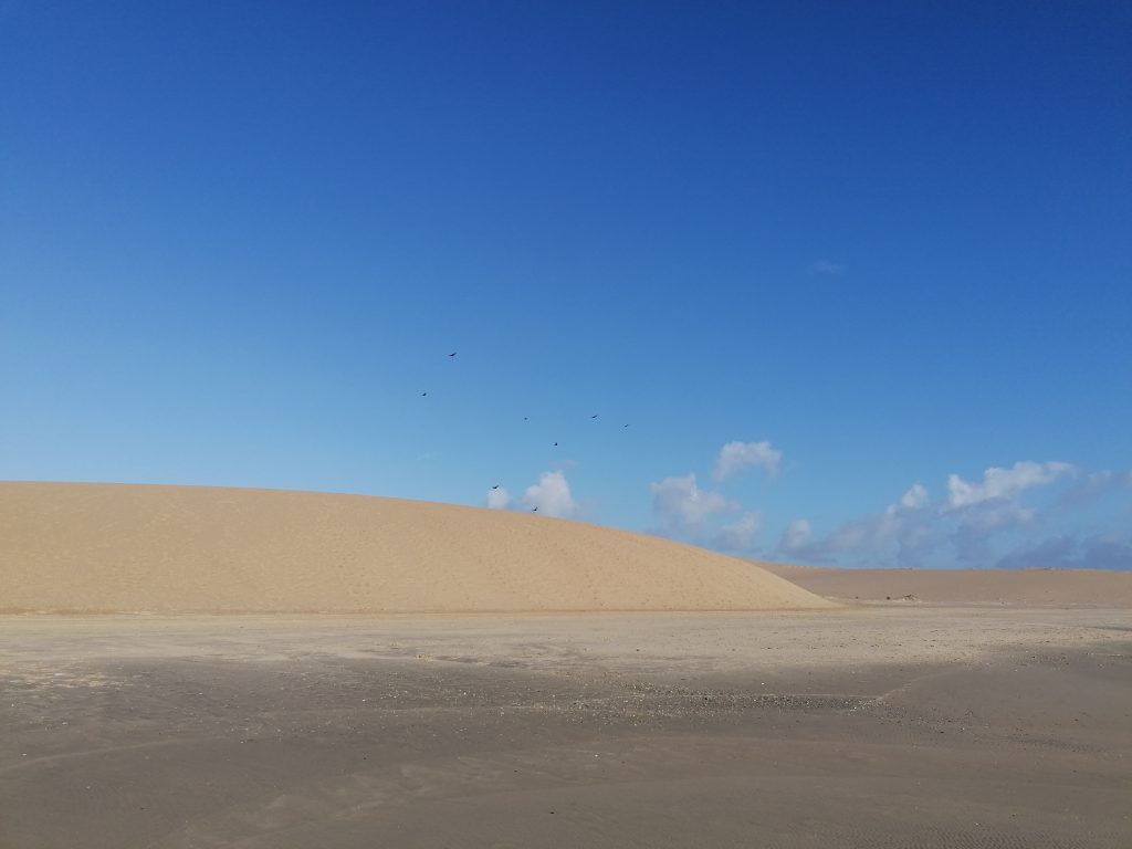 Leider verpasse ich den Sonnenaufgang am nächsten Morgen, bin aber gleich eine halbe Stunde später unterwegs. Da ich gestern schon die Seelöwen gesehen habe, gehe ich heute einfach nur viel am Strand spazieren. Ich gehe weit über die Grenzen des Dorfes hinaus. Hier hinten nimmt die Landschaft wirklich wüstenähnliche Züge an, mit riesigen Dünen, weit dahinter fängt erst der Kieferwald an. Man glaubt kaum, dass neben den riesigen Sanddünen der Ozean ist.