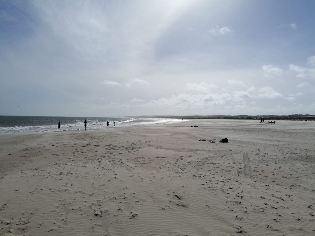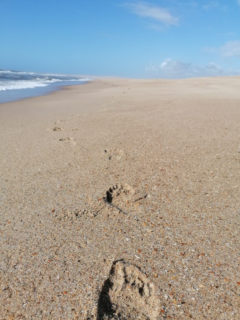 Mein Ehrgeiz jagt mich immer weiter den Strand entlang, ich will unbedingt bis ganz ans andere Ende, aber nach eineinhalb Stunden Fußmarsch in eine Richtung gebe ich auf. Ich hab nur ein bisschen Wasser dabei und die Sonne steigt immer höher… und der Strand nimmt einfach kein Ende. Ich habe längst jede Menschenseele hinter mir gelassen. Genießerisch drehe ich mich um mich selbst, atme durch und rufe und singe laut durch die Gegend. Es ist wunderbar.