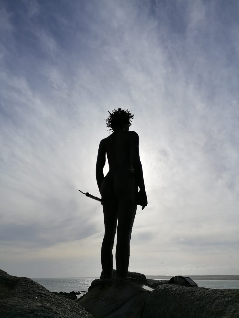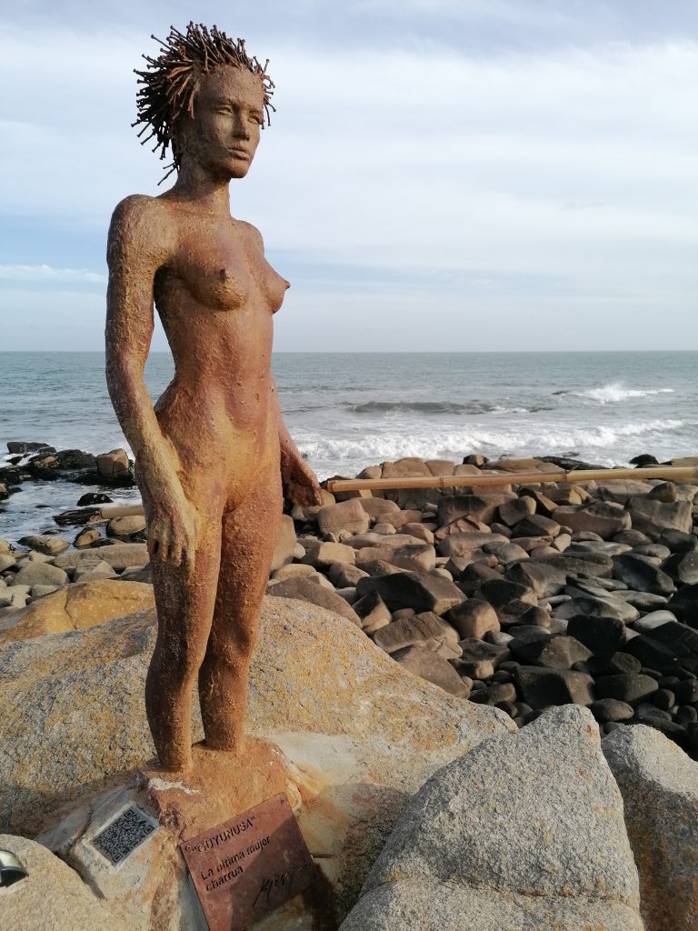 Auf dem Rückweg gehe ich an der Statue vorbei. Es ist eine Frau mit einem Speer, untertitelt mit „la ultima mujer charrua“ – Die letzte Charrua-Frau. Ich recherchiere ein wenig und wenn ich es richtig verstanden habe, waren die Charrua die Ureinwohner Uruguays und wurden Stück für Stück vertrieben oder ausgelöscht. Der Künstler setzt den Charrua hier ein Denkmal: Sie ist die letzte ihres Volkes. Ihre Füße sind im Stein verankert, sie wird sich nicht fortbewegen und für immer an die Charrua erinnern.