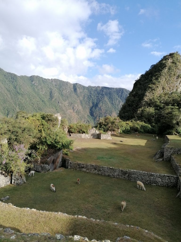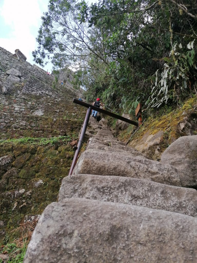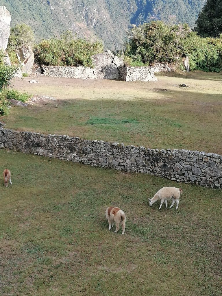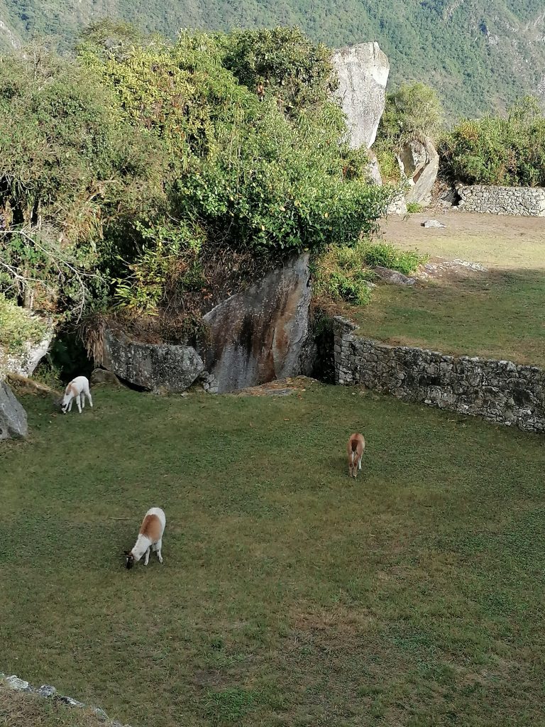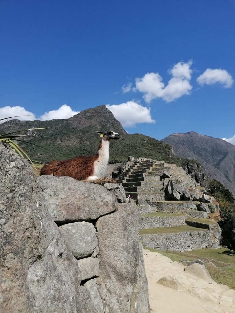 Die berühmten Machu Picchu Lamas. Waren wohl ursprünglich mal zwei. Naja, Lamas do what Lamas do und Tatarataa… Wir beobachten die süßen Tiere eine Weile, dann kommen wir zum Ausgangspunkt, lassen unsere Tickets prüfen und steigen dann nach oben. Also zuerst nach unten, dann nach drüben und dann nach oben… und nach oben… und nach oben. Puh, das ist schon anstrengend. Vor allem finde ich Treppenstufen an sich recht undankbar, weil sie nicht die eigene Schrittlänge haben, sondern oft höher sind. Echt faszinierend, wie sind denn die kleinen Incas da damals hochgestiegen?! Das sind richtig hohe Stufen dabei!! Oh, aber der Ausblick auf die gegenüberliegenden Ruinen…