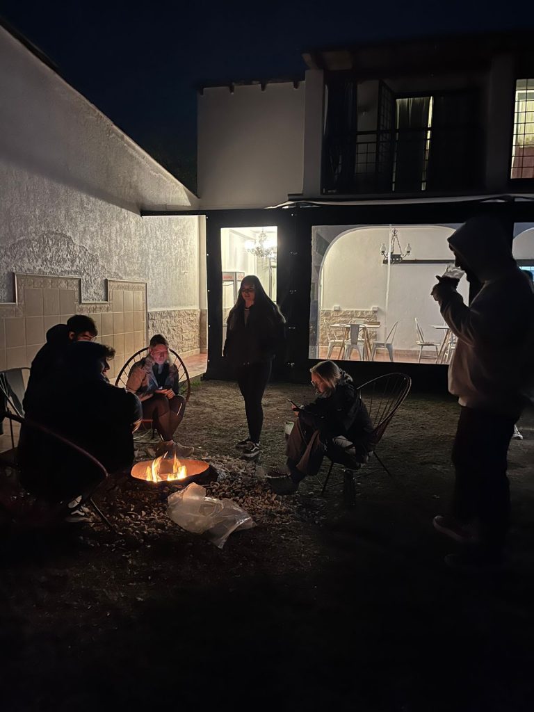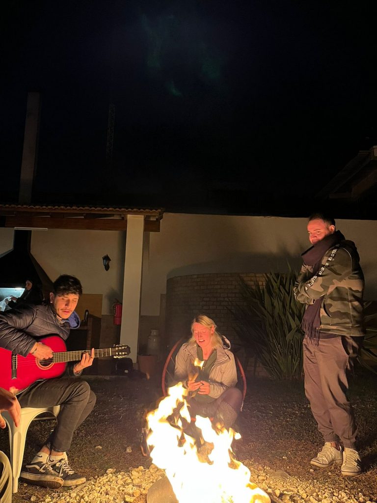 Draußen brennt ein Feuer, ich wollte mich eigentlich nur kurz dazu setzen, aber dann fügt sich wieder eine Gruppe aus Leuten zusammen und wir beschließen spontan ein Asado zu machen. Emiliano ist einer der Hostelmitarbeiter und kümmert sich um alles. Während er das Feuer im Grill schürt und das Fleisch auflegt, holt sein Cousin… ich hab seinen Namen vergessen, Mist. Naja, er holt die  Gitarre, hat gehört ich kann singen. Ich schaue zu Mercedes, sie zuckt mit den Schultern. Also nicke ich, aber ich singe ungern alleine. Alle ziehen ihre Handys raus und wir singen zusammen, Englisch, Spanisch, wer kann und will. Es macht Spaß und … der Cousin (sorry, Mann) spielt richtig gut Gitarre. Hier sitzen wir alle, unter argentinischem Nachthimmel, Einheimische und Internationale, um das brennende Feuer, das Asado brutzelt nebenan vor sich hin, spielend und singend mit der Gitarre. Es ist perfekt. Später spielen Emiliano und sein Cousin zusammen mit Gitarre und Trommel und singen wunderschöne Lieder, während der Rest andächtig zuhört.
