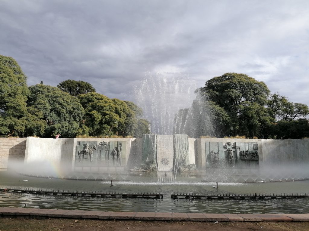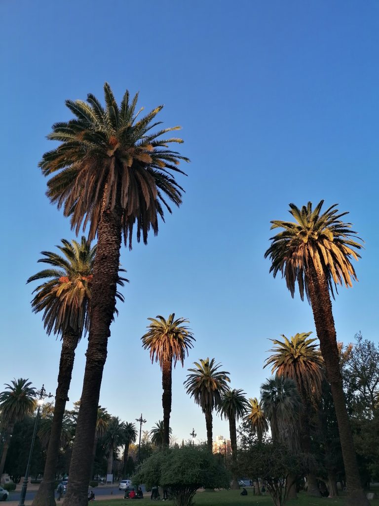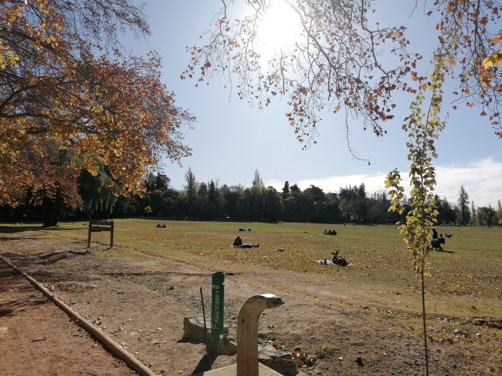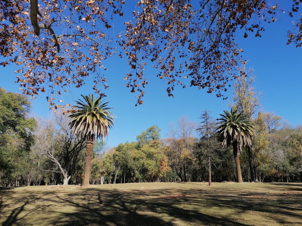 Ich beschließe am Nachmittag in den großen Park „San Martin“ zu gehen. Der Park ist so riesig, er hat Straßen, sodass man mit dem Auto oder mit dem Bus zu den verschiedenen Zielen fahren kann. Ich laufe hin und ein Stück weit rein, mein Ziel ist  der Cerro Gloria, ein Hügel mit einem Denkmal im Norden des Parkes. Aber der Park ist so riesig, dass es mich nochmal eine ganze Stunde kosten würde, bis zum Nordende zu kommen. Ich überlege einen Bus zu nehmen, beschließe dann aber, mich schon früher auf eine Wiese zu setzen. Ich suche mir einen schönen Platz, ziehe die Schuhe aus und lege mich in die Sonne. Ciau Kultur, hallo Entspannung.