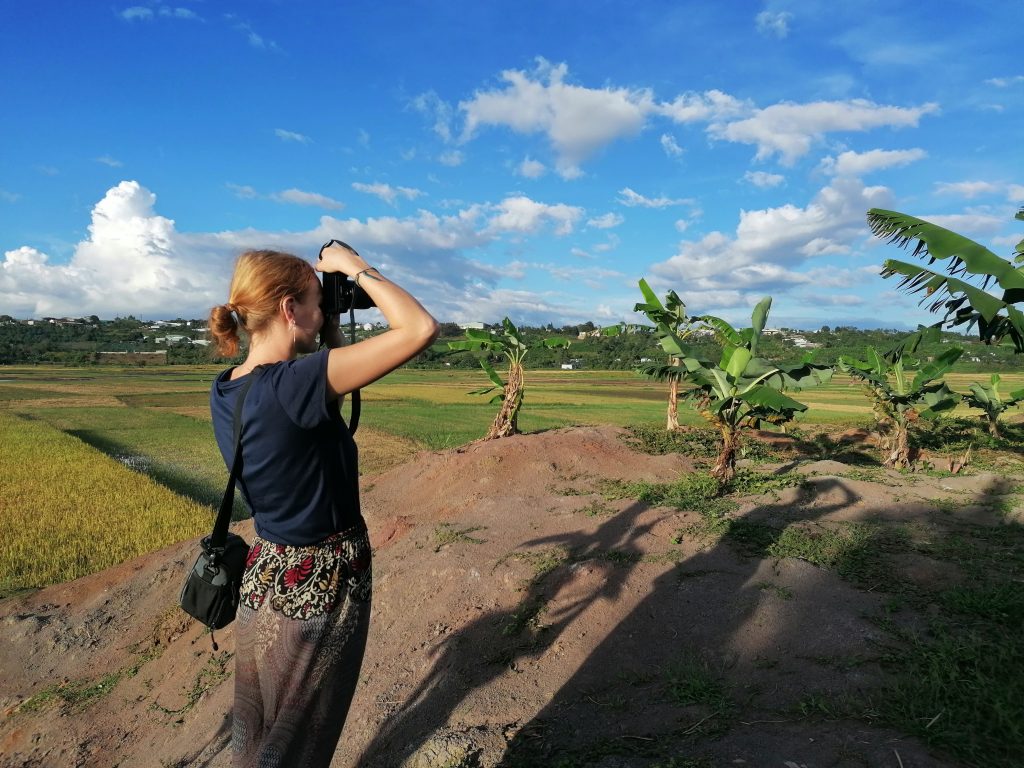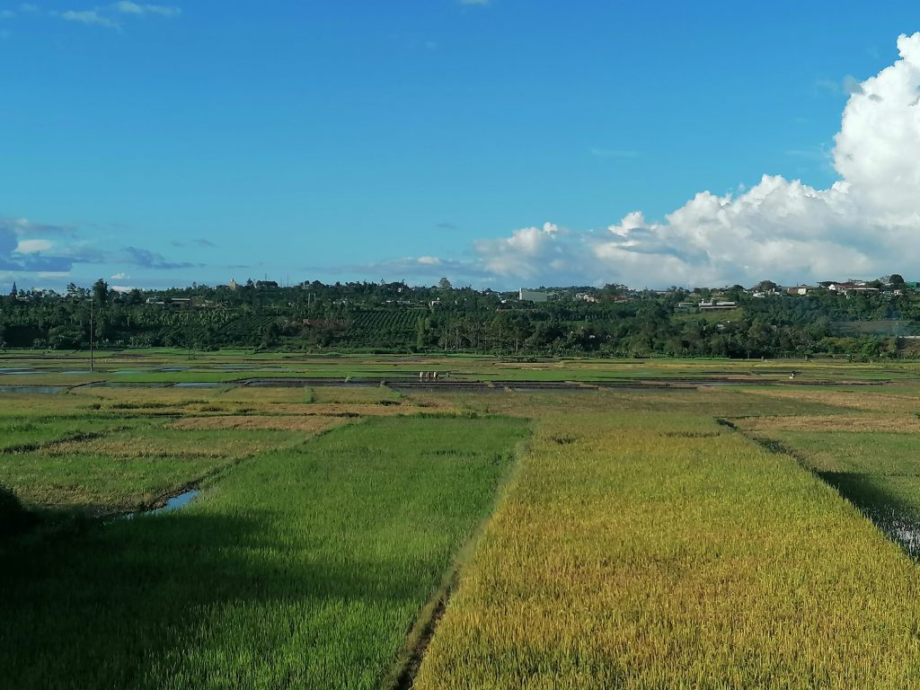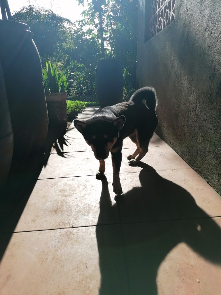 Am Nachmittag kriegen wir dann doch noch frei und gehen zusammen spazieren. Wir befreien einen der Hunde und nehmen ihn mit, der Ausflug tut ihm sichtlich gut. Und uns auch. Das Wetter ist herrlich, die Sonne scheint, die Landschaft ist toll. Ich hatte beim Laufen einen nahegelegenen Punkt entdeckt, von dem aus man schön über die Reisfelder im Tal schauen kann. Dort machen wir halt und verbringen eine Weile ganz in Ruhe, machen Fotos, entspannen.