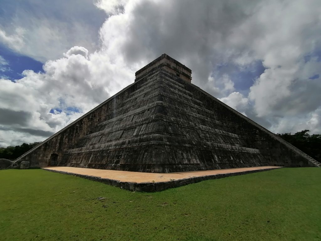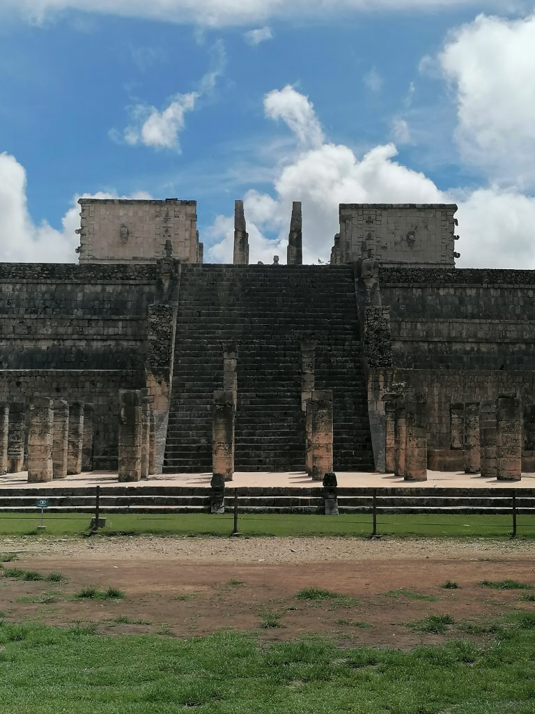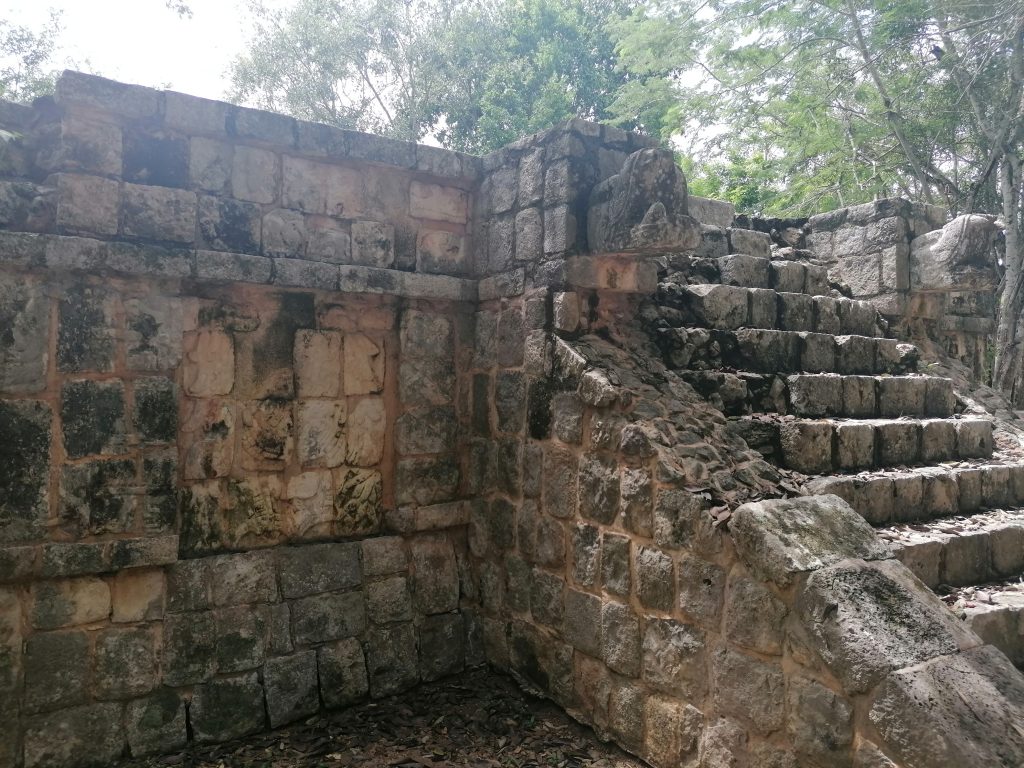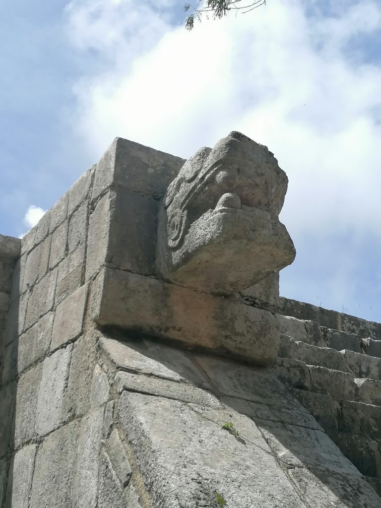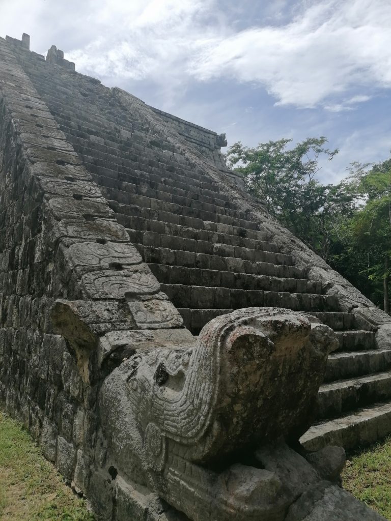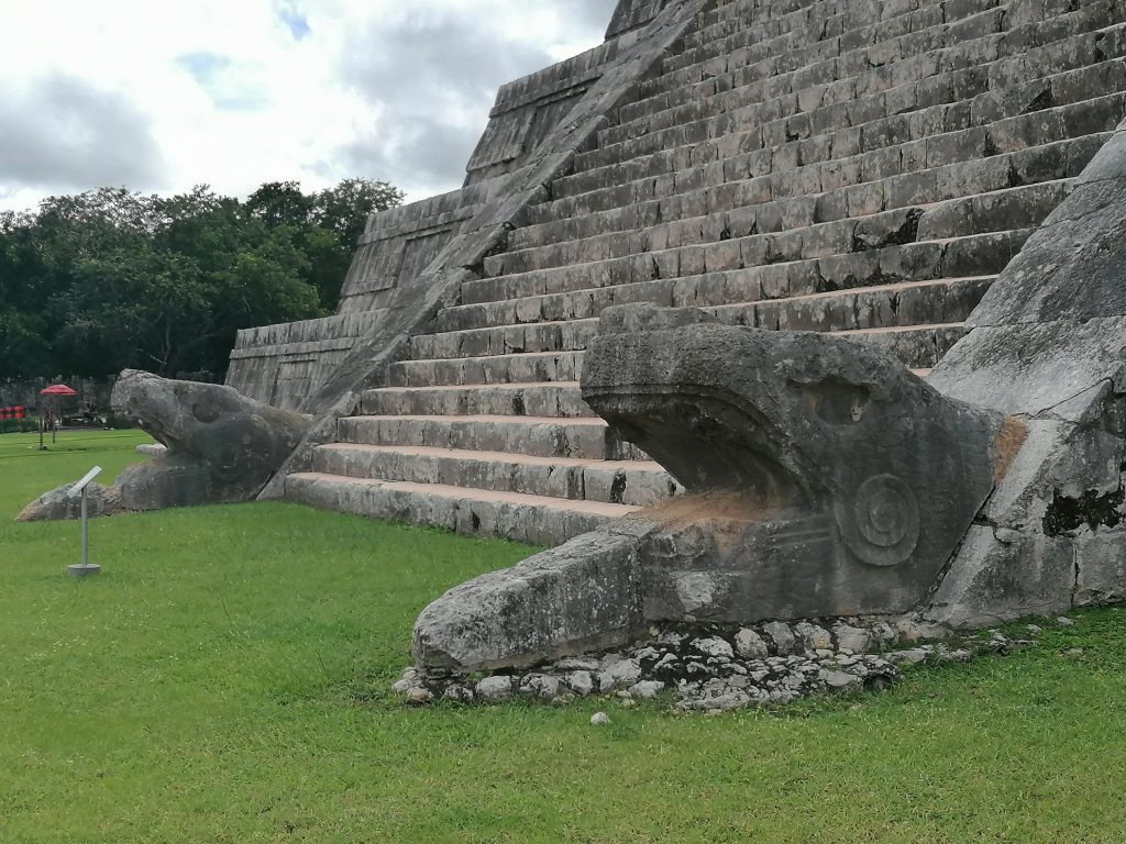 Gewidmet ist die Pyramide dem Hauptgott der Mayas: Kukultan. Der Name ändert sich mit dem Dialekt in Guatemala und Nordmexiko ein bisschen, bezeichnet aber denselben Gott: Eine gefiederte Schlange. Solche sind auch an den Geländern der Stufen gebaut, die natürlich wieder den Schalleffekt eines Vogelrufes haben, wenn man davor klatscht.