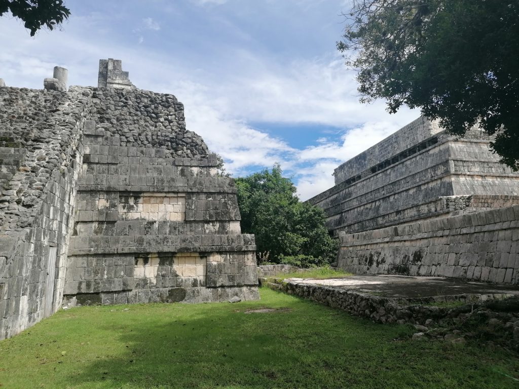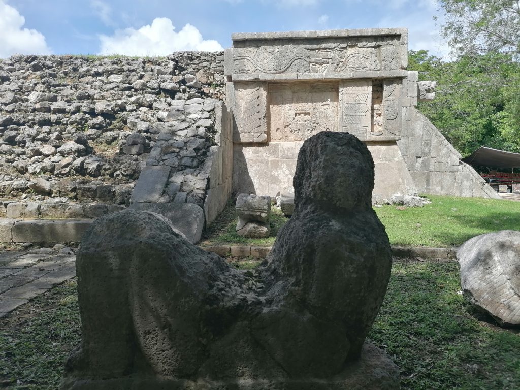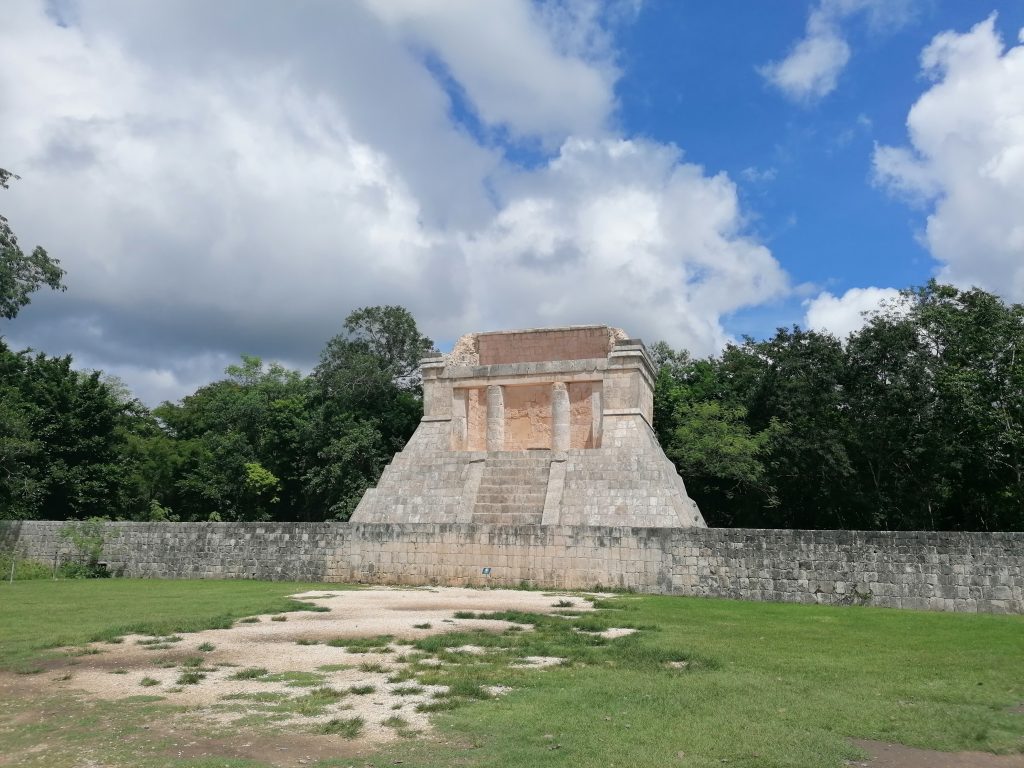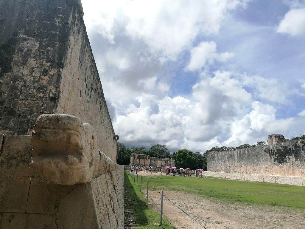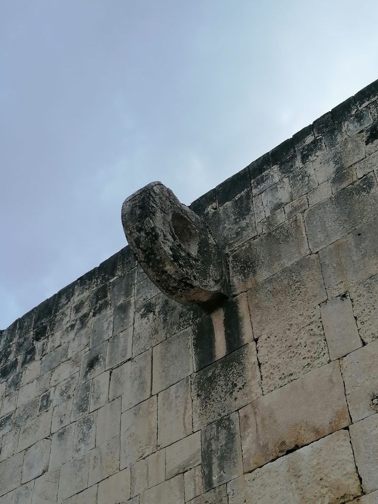 Hier hat der Stolz der Hochkultur stattgefunden: Maya-Fußball. Also, nicht ganz, aber so ungefähr muss man es sich vorstellen. „Juego de pelota – Spiel des Gummiballs“ (grob übersetzt) hieß es. Dabei haben zwei Teams mit je sechs Spielern und einem Teamkapitän versucht, einen Gummiball durch einen Ring zu befördern, der etwa drei Meter über ihnen an einer Mauer des Stadions angebracht war.
