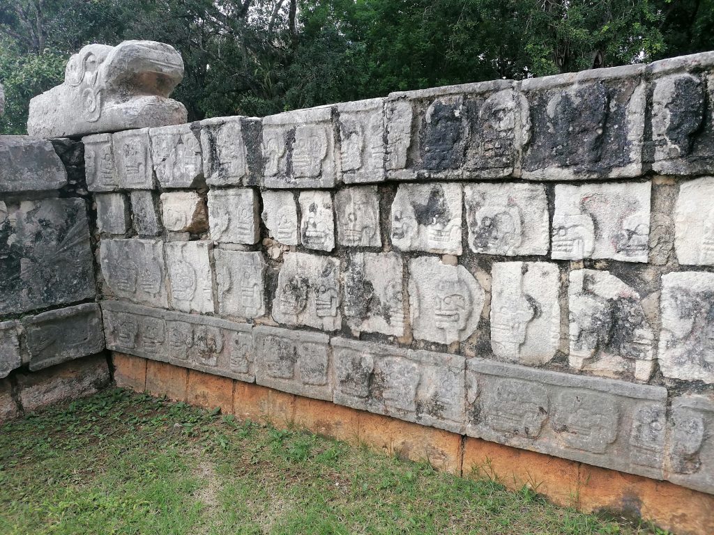 Anders bei dem nächsten Ort, zu dem wir gehen: Der Friedhof der Kriminellen. Anders als die Azteken haben die Mayas keine Gebäude aus den Köpfen ihrer Feinde/Kriminellen gebaut. Aber Gesetzesbrechern wurde schon der Kopf abgeschlagen und öffentlich ausgestellt. Das war eine Demütigung für den Delinquenten und vor allem war so keine Reinkarnation mehr möglich. Der Guide zeigt uns eine kleine Mauer, in den Totenköpfe eingraviert sind, als Mahnmal.