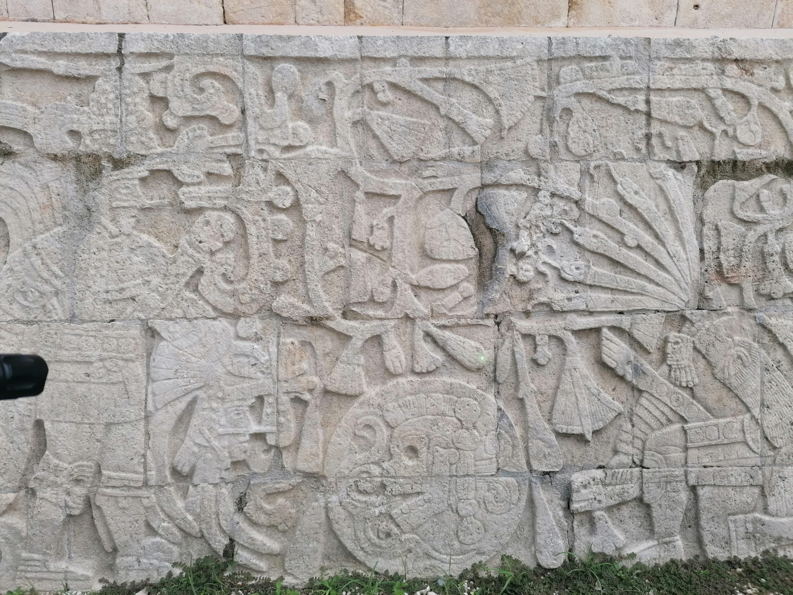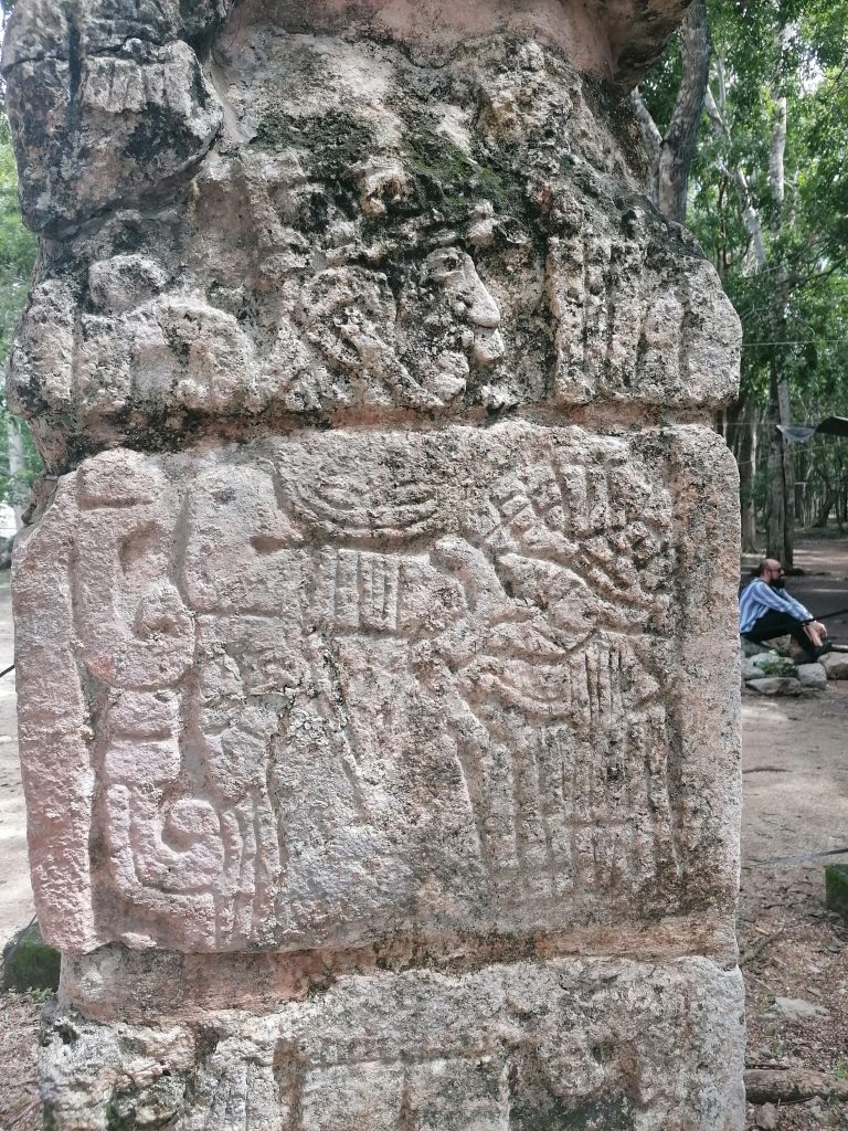 Wir beginnen mit einem besonderen Detail, bevor er uns den Sinn und Zweck des Stadions erklärt. Am Kopf befindet sich ein „kleiner Tempel“ in dem man ein besonderes Relief findet. Er zeigt uns ein Bild, leider hab ich kein Foto davon. Das Relief zeigt eine Szene in der ein besonderer Mann vorkommt: Ein Mann mit Helm und Bart. Das ist ungewöhnlich, die Mayas sind immer haarlos dargestellt und Helme haben sie nie benutzt: Ist der Mann auf diesem Bild ein Wikinger?