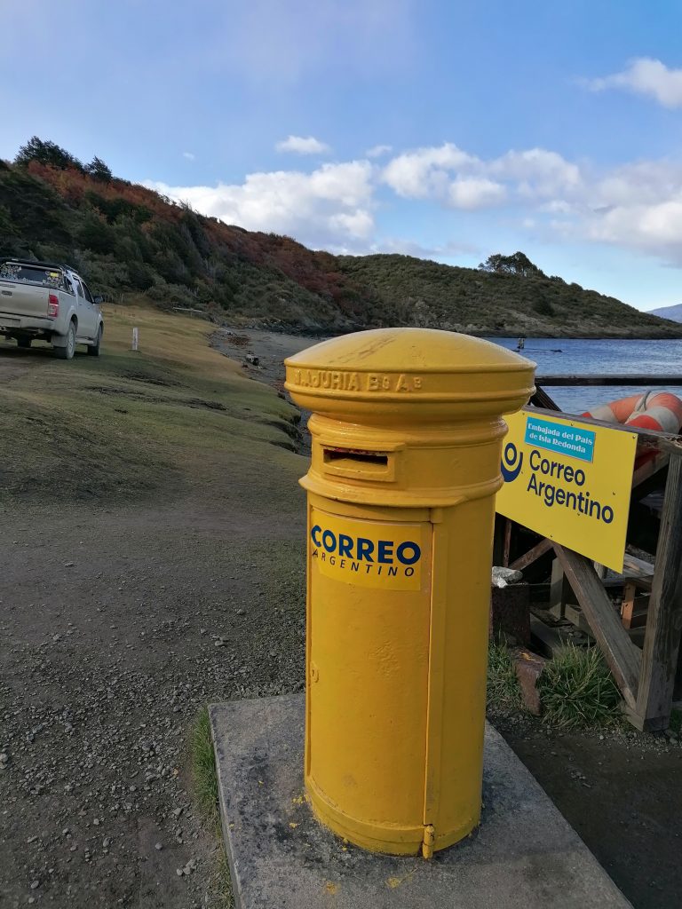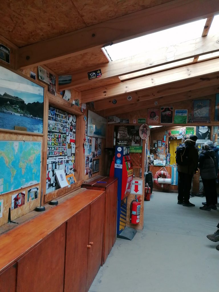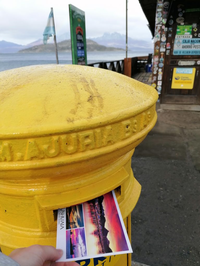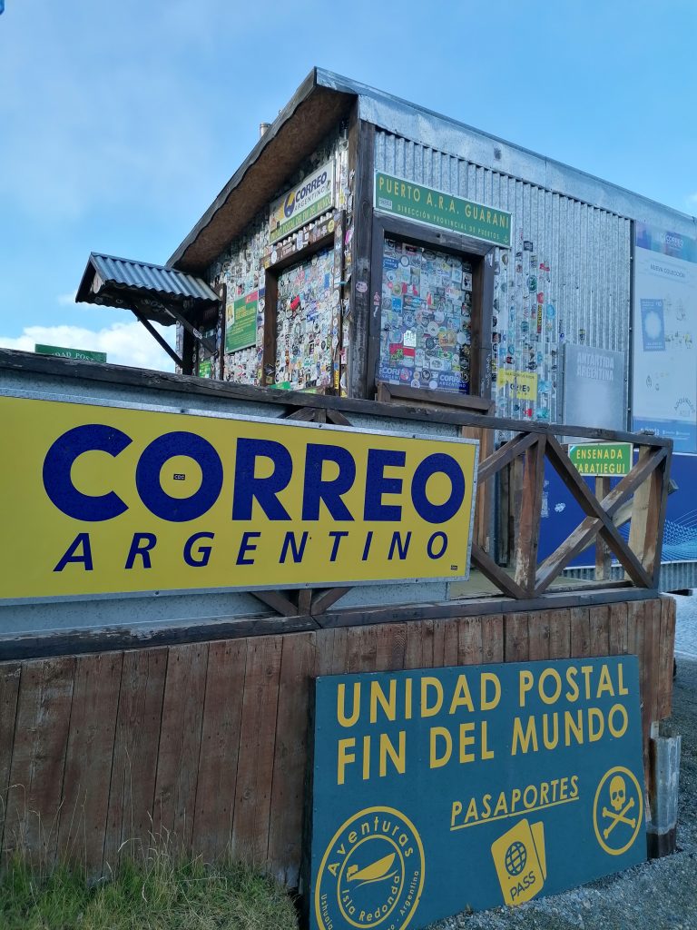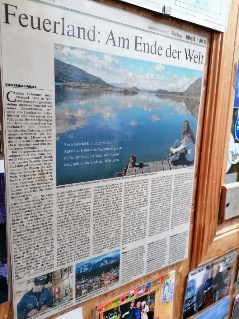 Ich präsentiere: Das südlichste Postamt der Welt. Und da ich zuvor noch in der Stadt eine Karte gekauft und voller Liebe voll schief eine Nachricht draufgekritzelt habe, kann ich die jetzt auch abschicken. Kostet gar nicht so viel, wie ich dachte. Außerdem kann man sich einen Stempel vom Ende der Welt abholen, was ich mir natürlich nicht entgehen lasse. Das Postamt ist voll mit Zeitungsartikeln, Fotos, Karten aus den langen Jahren, die der Betreiber schon hier ist. Mittlerweile hat der Sohn übernommen, aber ich entdecke einen deutschen Zeitungsartikel, in der ehemalige Postbeamte vom Ende der Welt beschrieben wird.