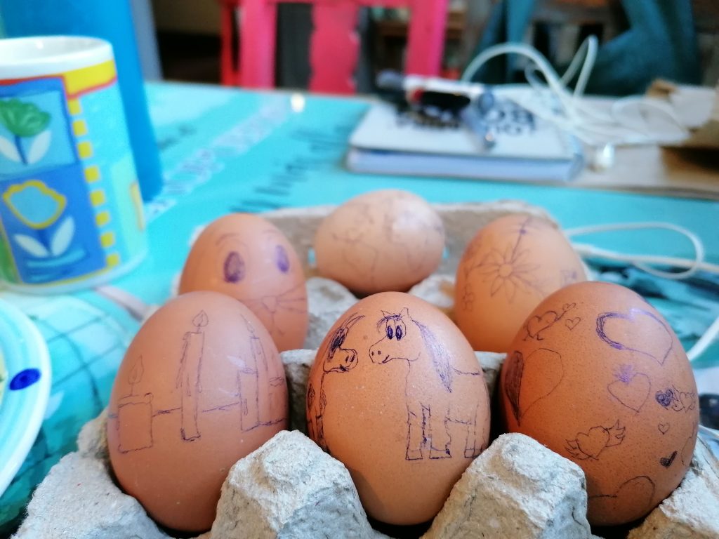 Die anderen staunen nicht schlecht, als ich eine Schachtel Eier aus dem Kühlschrank hole und mit Kugelschreiber draufkritzle. Eine Mitbewohnerin, mit der ich mich die letzten Tage schon ein paar Mal unterhalten habe, ist ganz begeistert von der Idee. Sie sitzt an ihrem eigenen Zeichenprojekt (von dem ich übrigens ganz begeistert bin) und so sitzen wir da und leben unsere Kreativität aus. Es ist ein richtig schöner und sicherlich unvergesslicher Ostermorgen. Am Abend gibt’s übrigens Rührei J